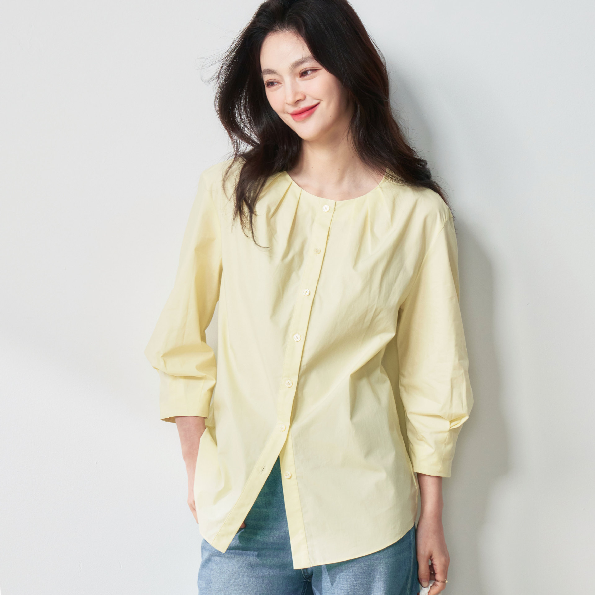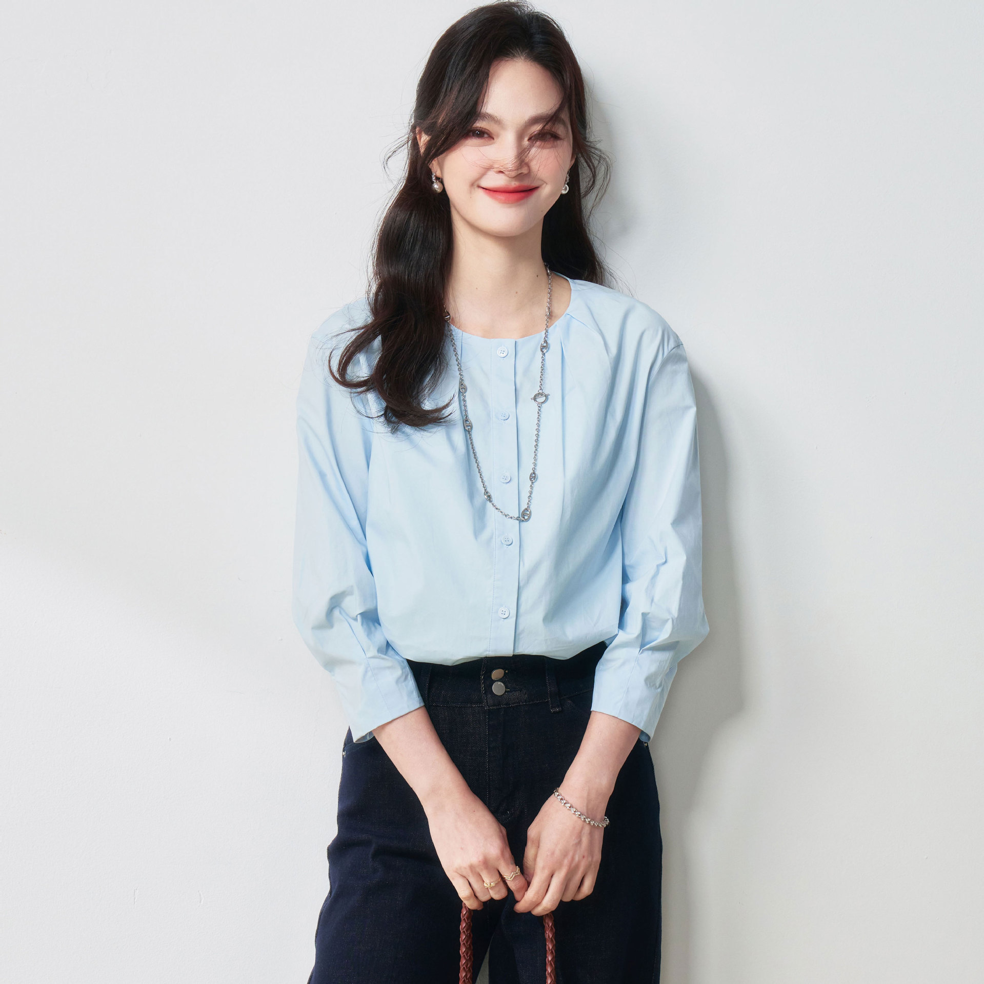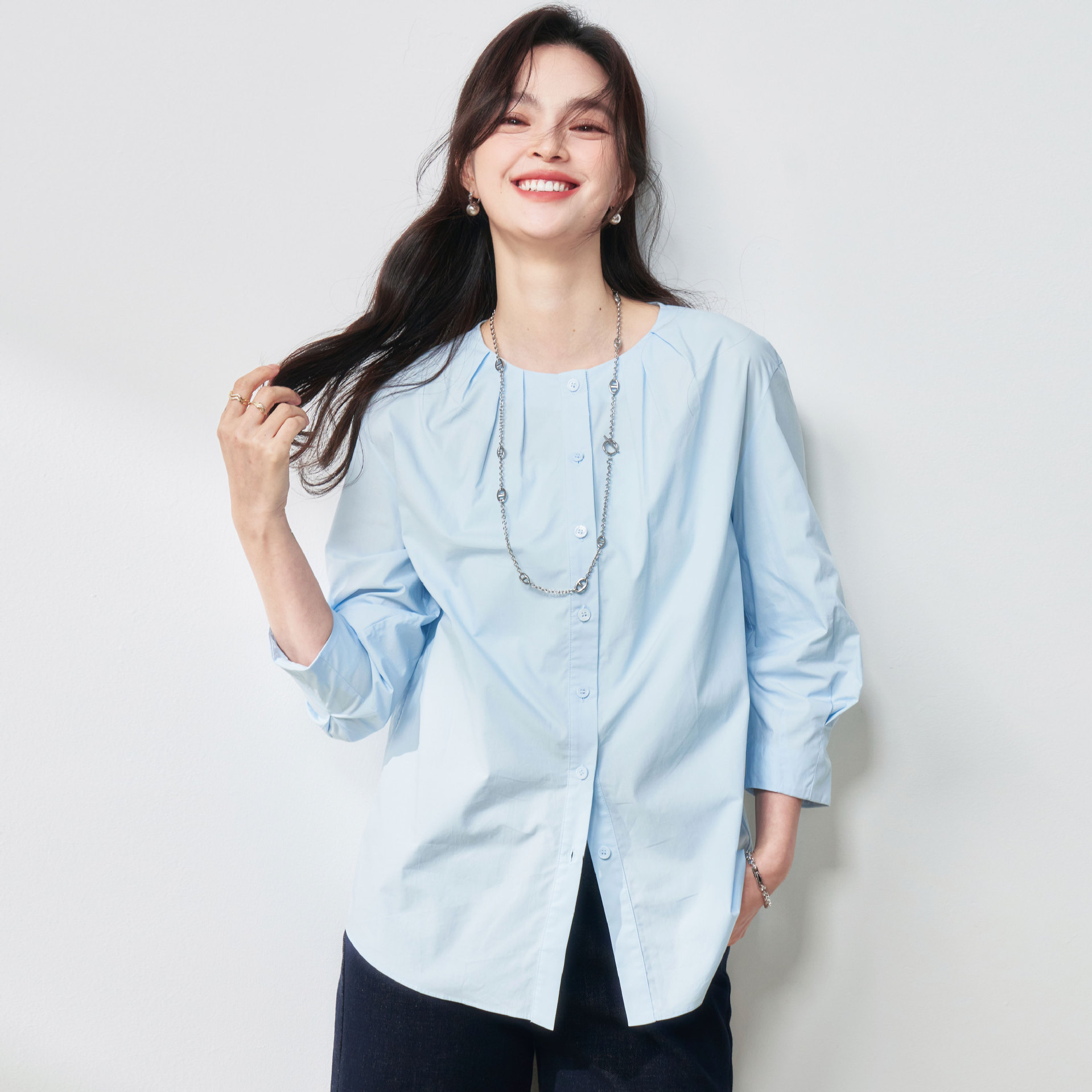 25秋季法式灯笼袖衬衫纯棉七分袖宽松圆领简约通勤百搭上衣25078