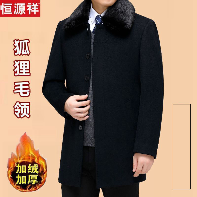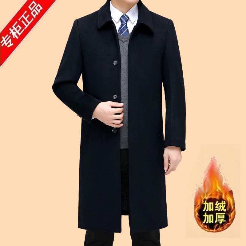 过膝长款大衣男士中年加绒加厚保暖风衣加毛领外套中长款棉衣服男
