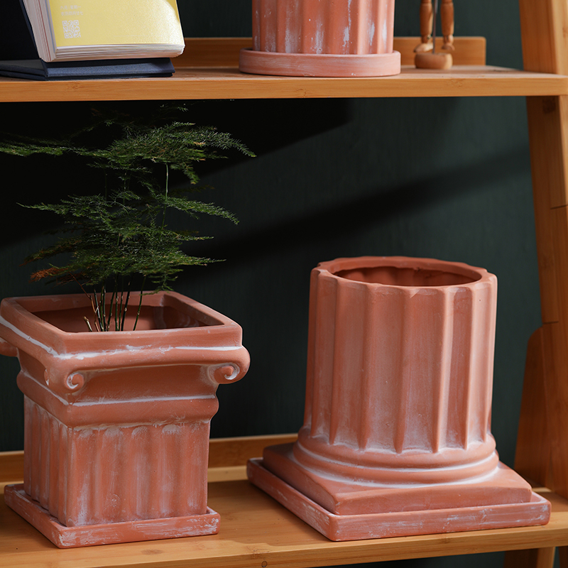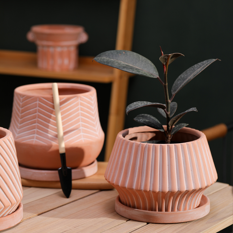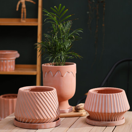 红陶花盆透气土陶泥瓦盆自吸水浮雕田园粗陶种绿植盆栽陶瓷带托盘