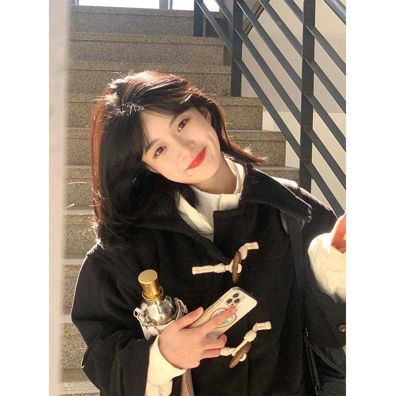 牛角扣黑色毛呢大衣女秋冬2024新款中长款小个子连帽呢子外套加厚