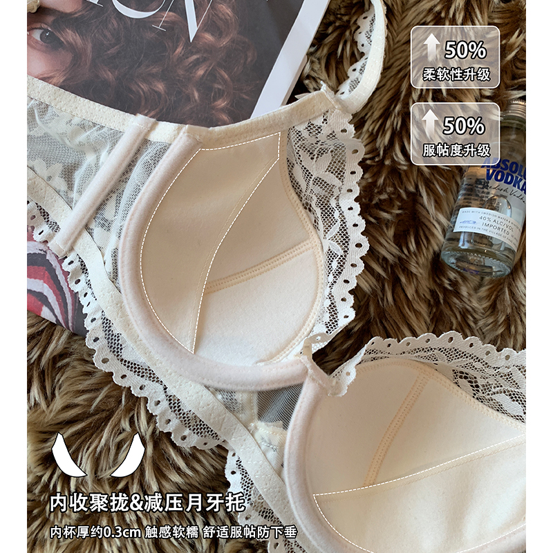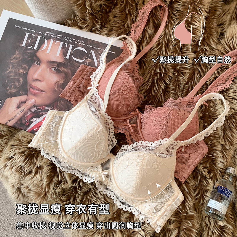 薄款法式性感蕾丝内衣女士纯欲大胸显小有钢圈防下垂收副乳文胸罩