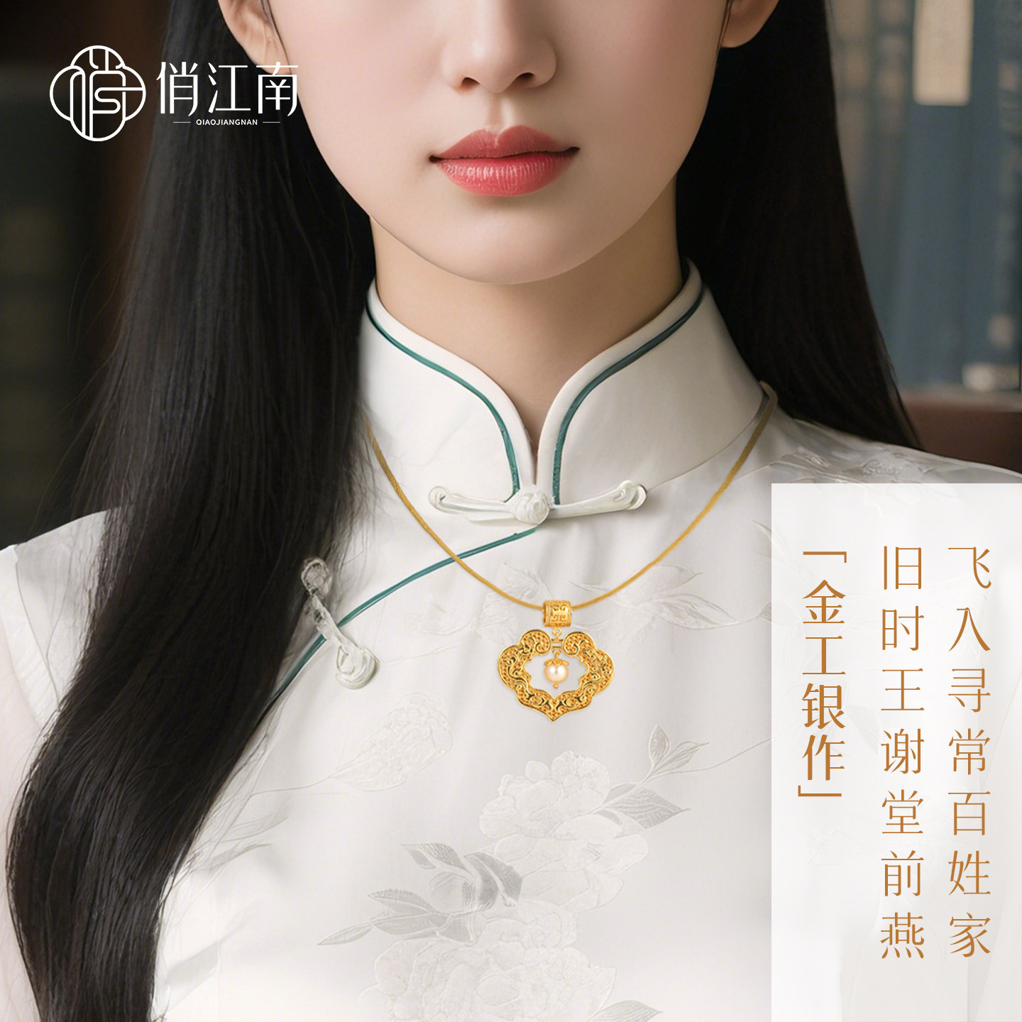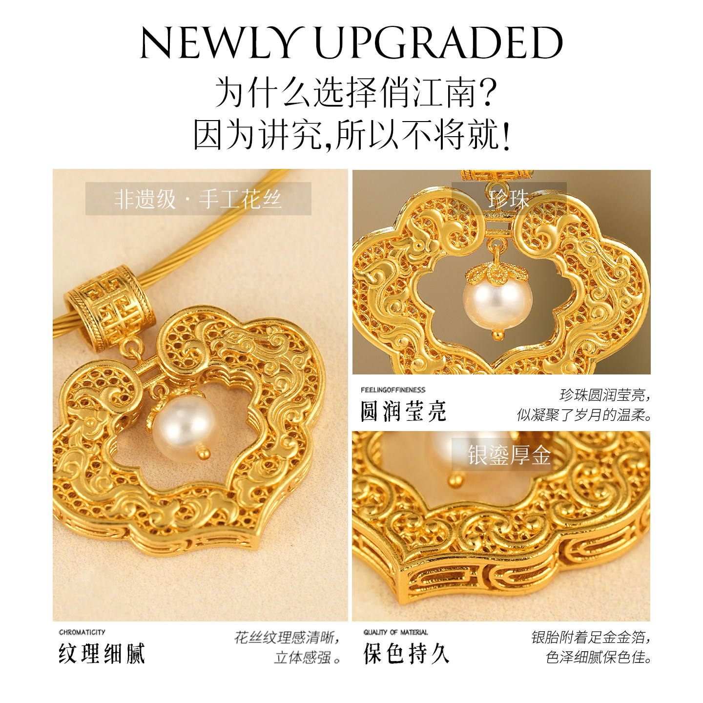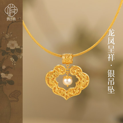 龙凤呈祥珍珠纯银鎏金平安锁项链非遗花丝镂空新中式银福锁长命锁