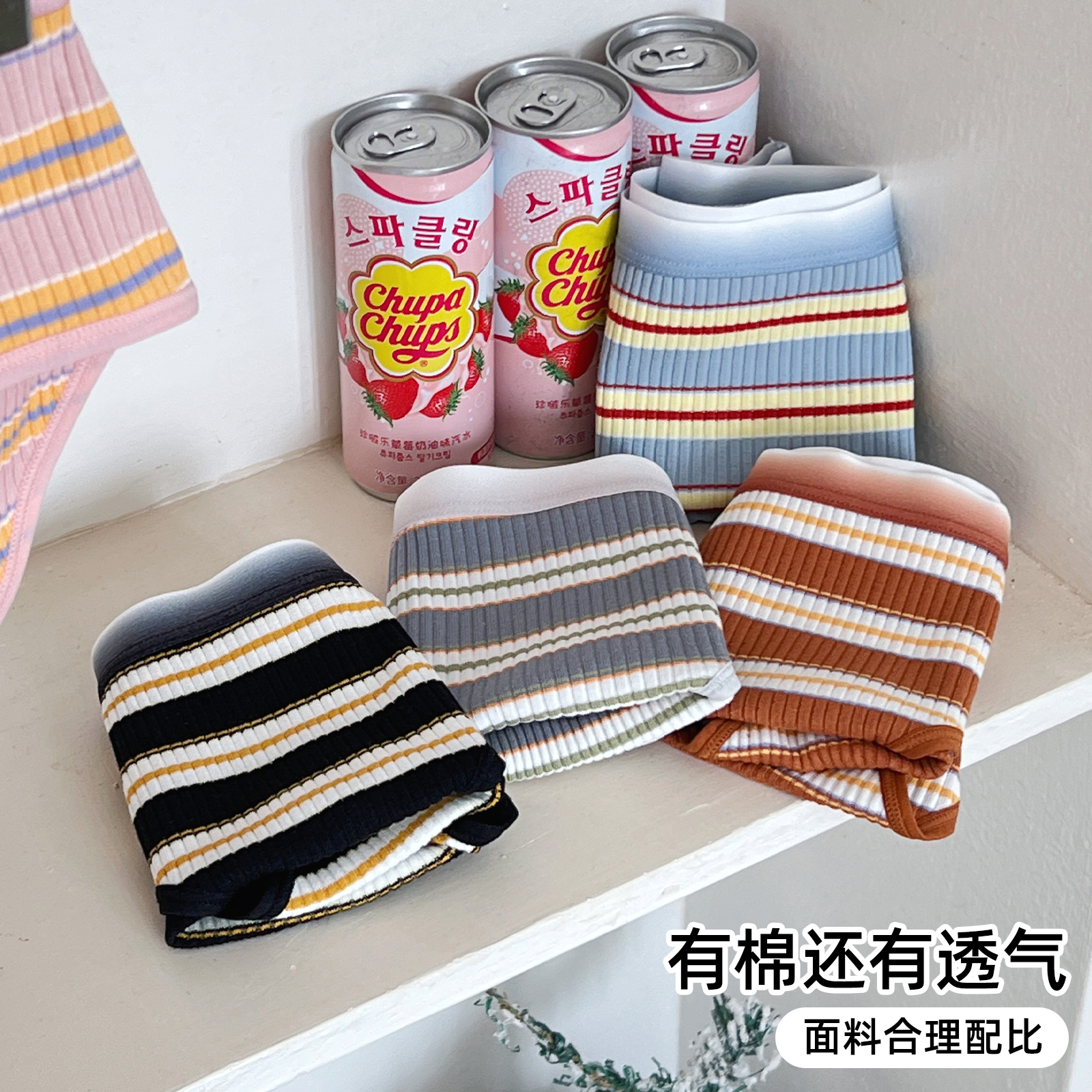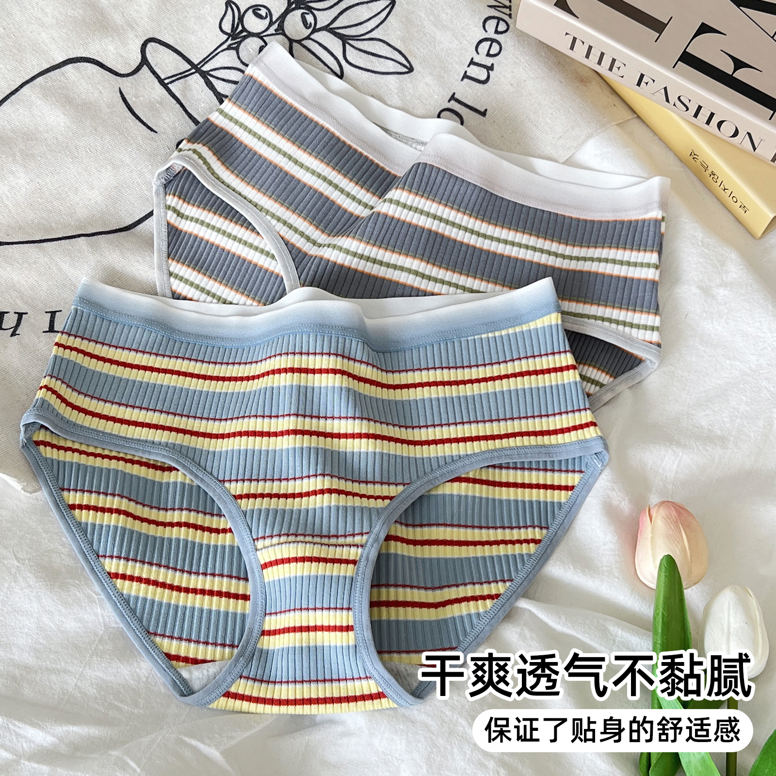 六只兔子5A抗菌内裤女纯棉透气底裆条纹三角裤短裤中腰弹力裤头