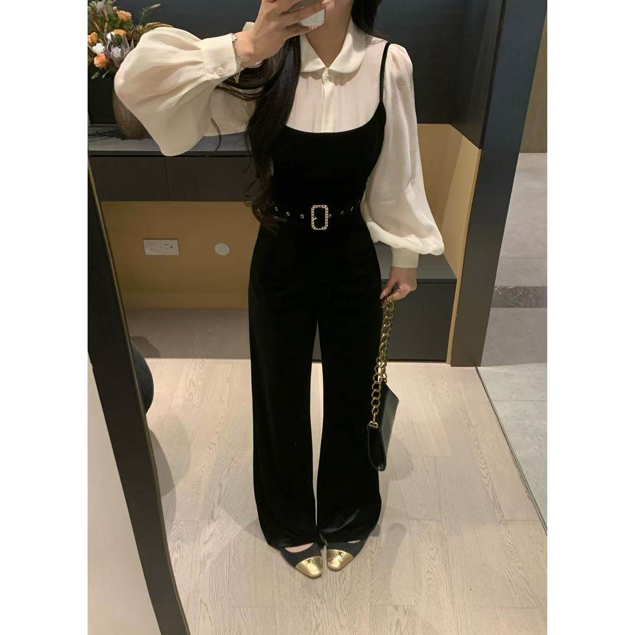 XINYI【高知文学】冬季天丝衬衫+吊带丝绒连体裤显瘦百搭套装女