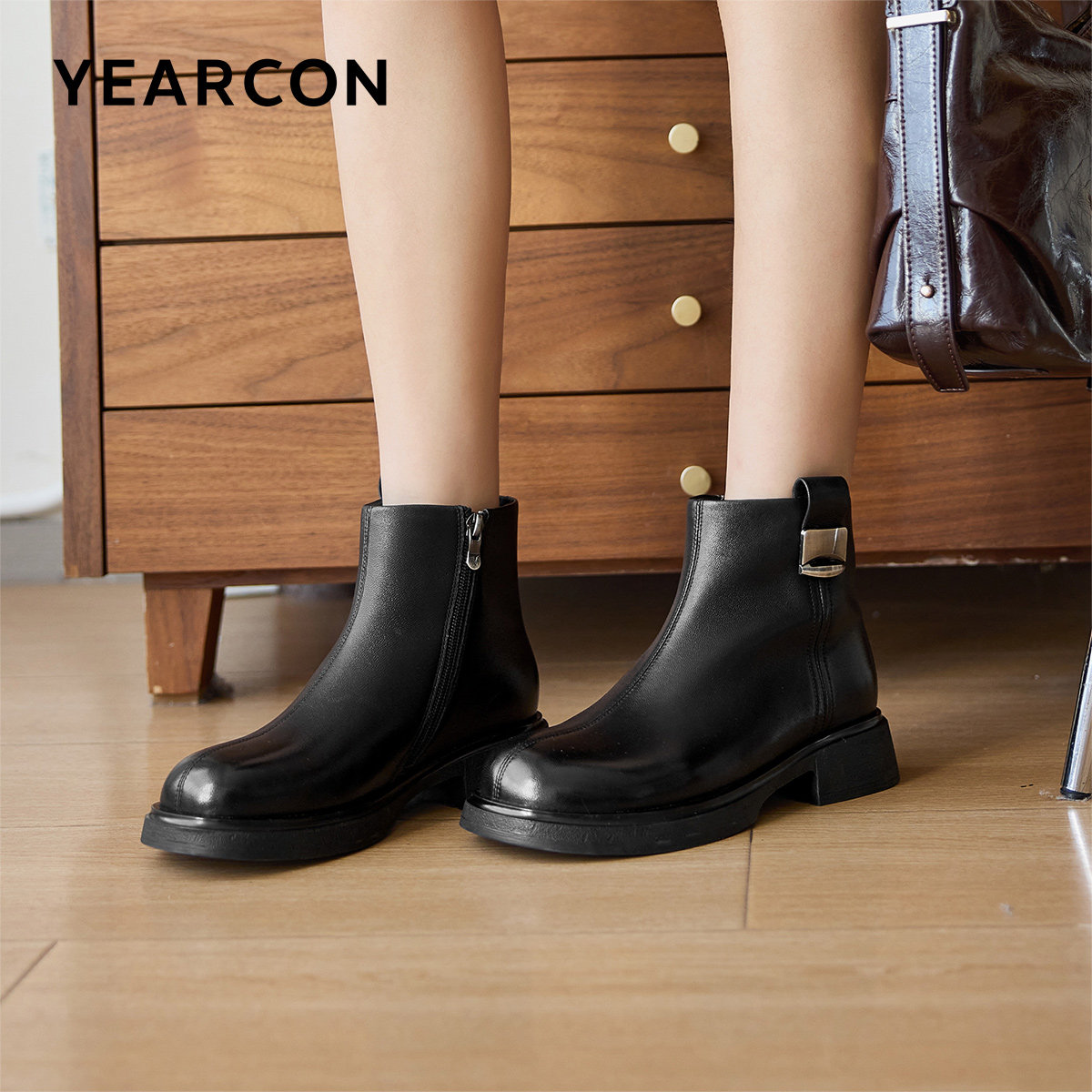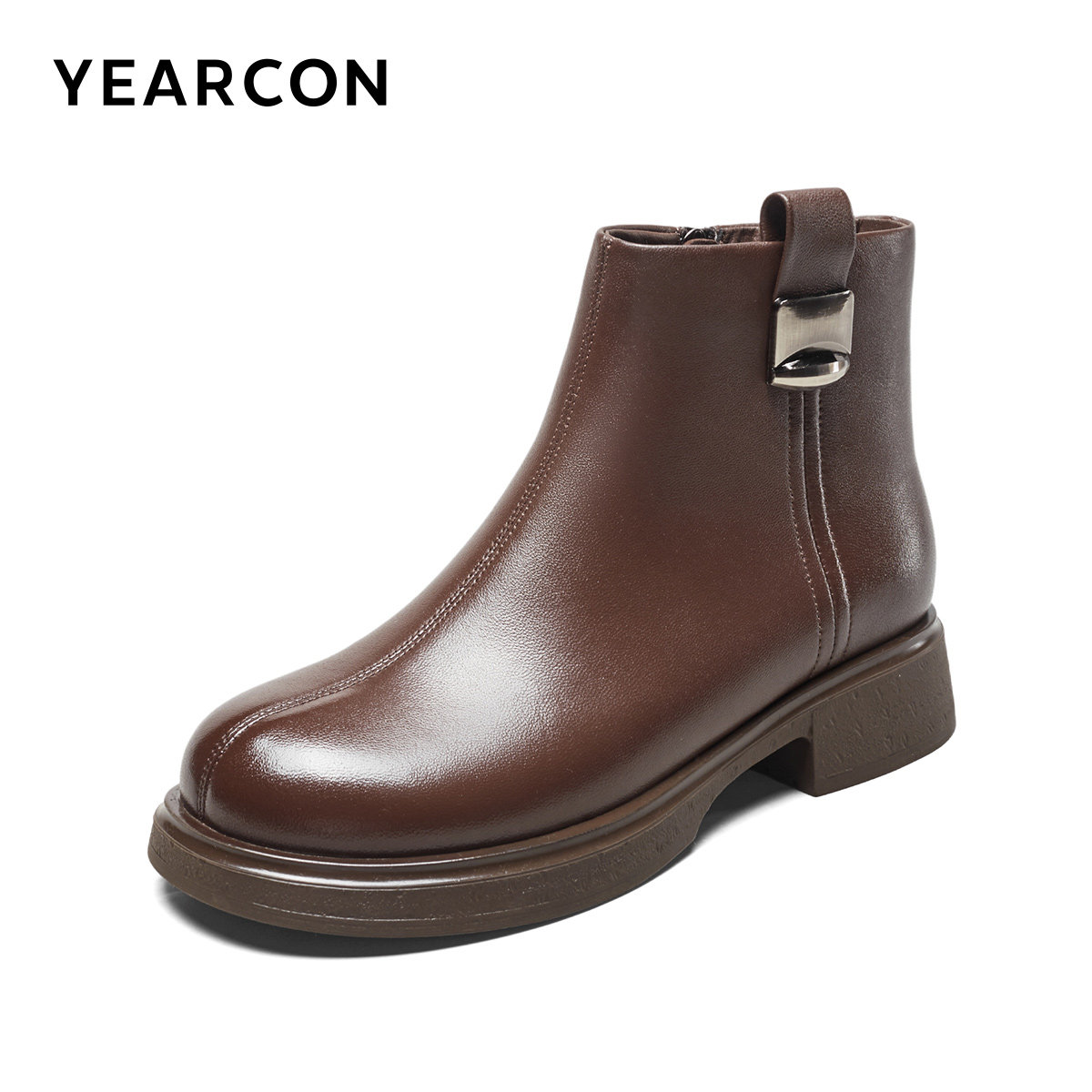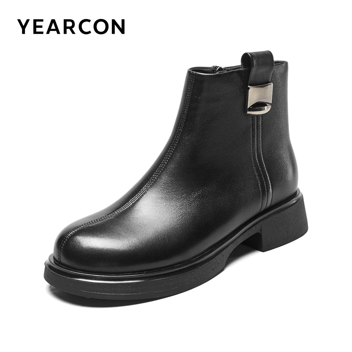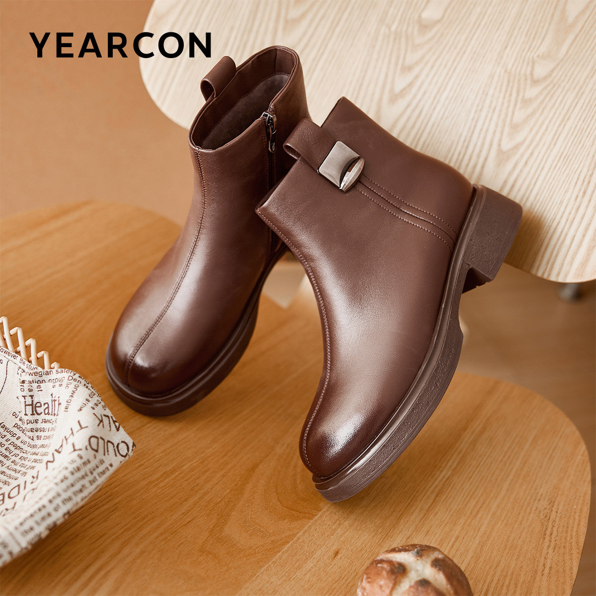 意尔康女靴2025新款冬季真皮短靴女加绒靴子粗跟切尔西靴中跟短筒