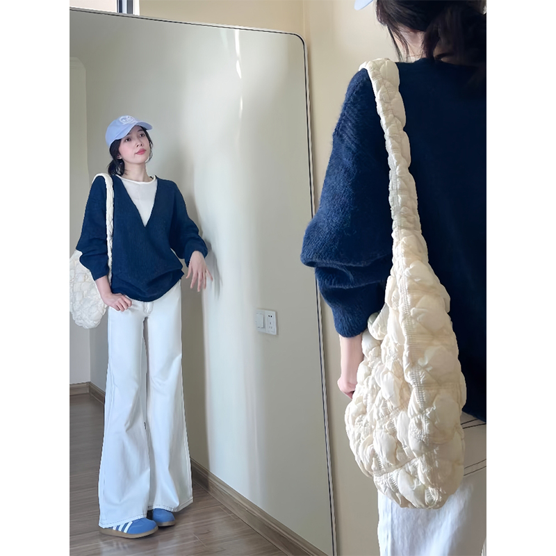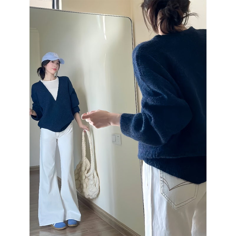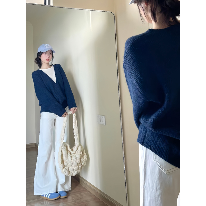 韩版松弛感洋气简约休闲宽松百搭长袖圆领撞色假两件针织衫毛衣女
