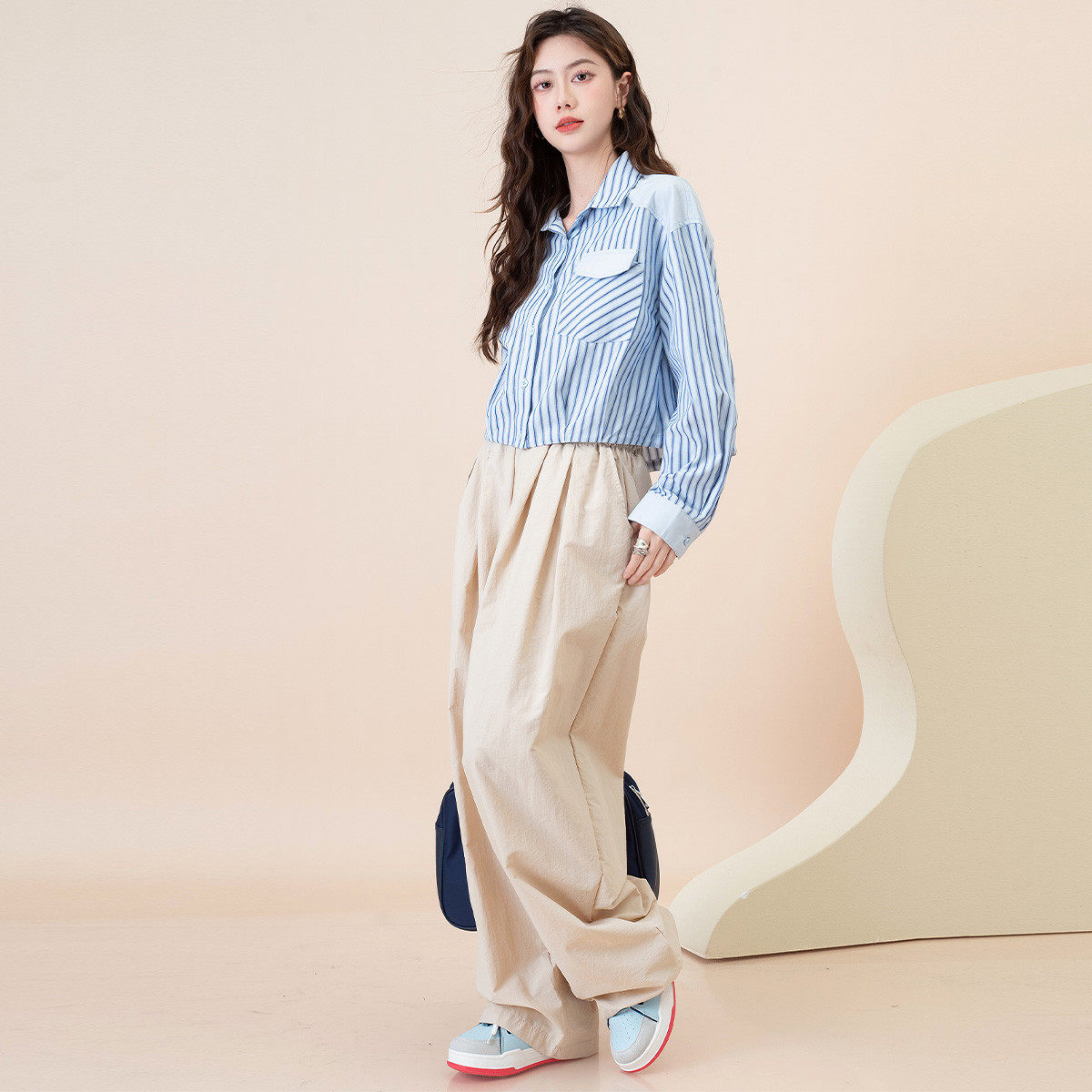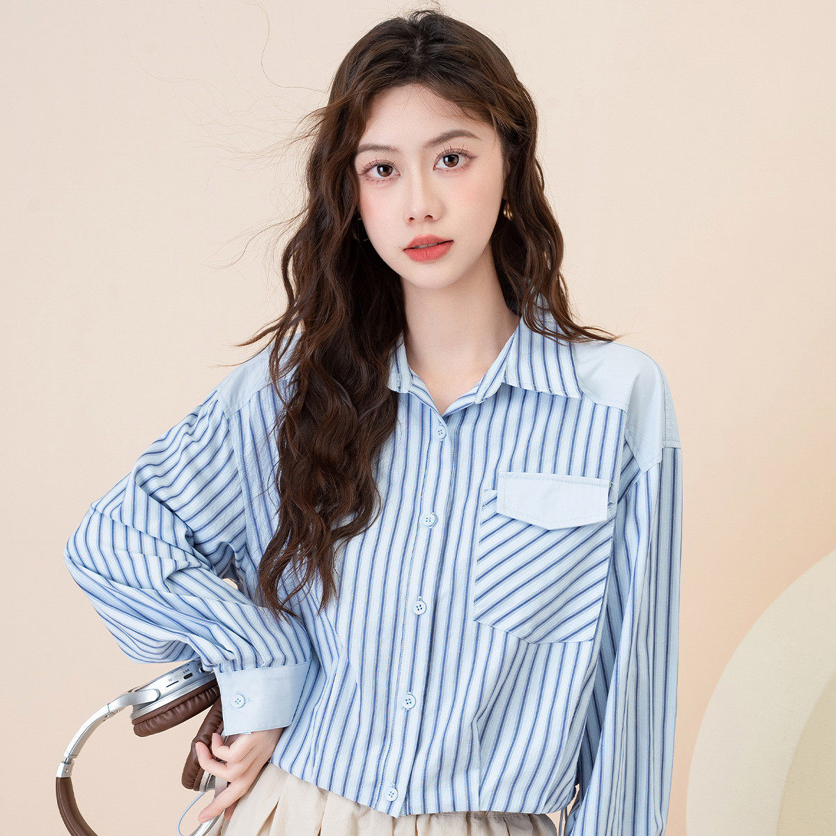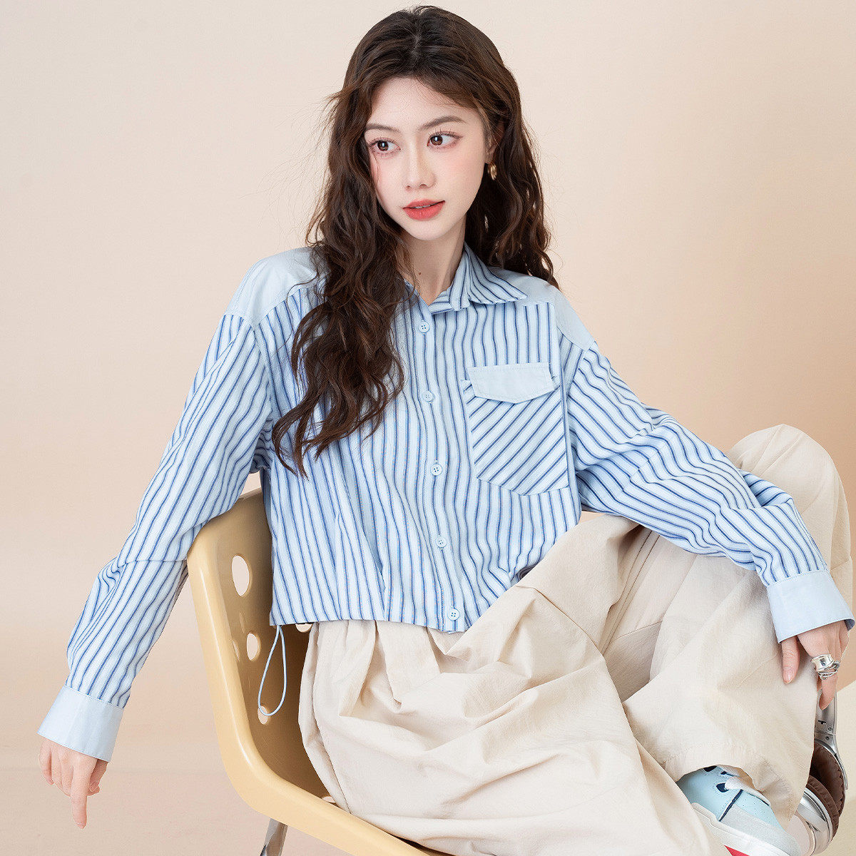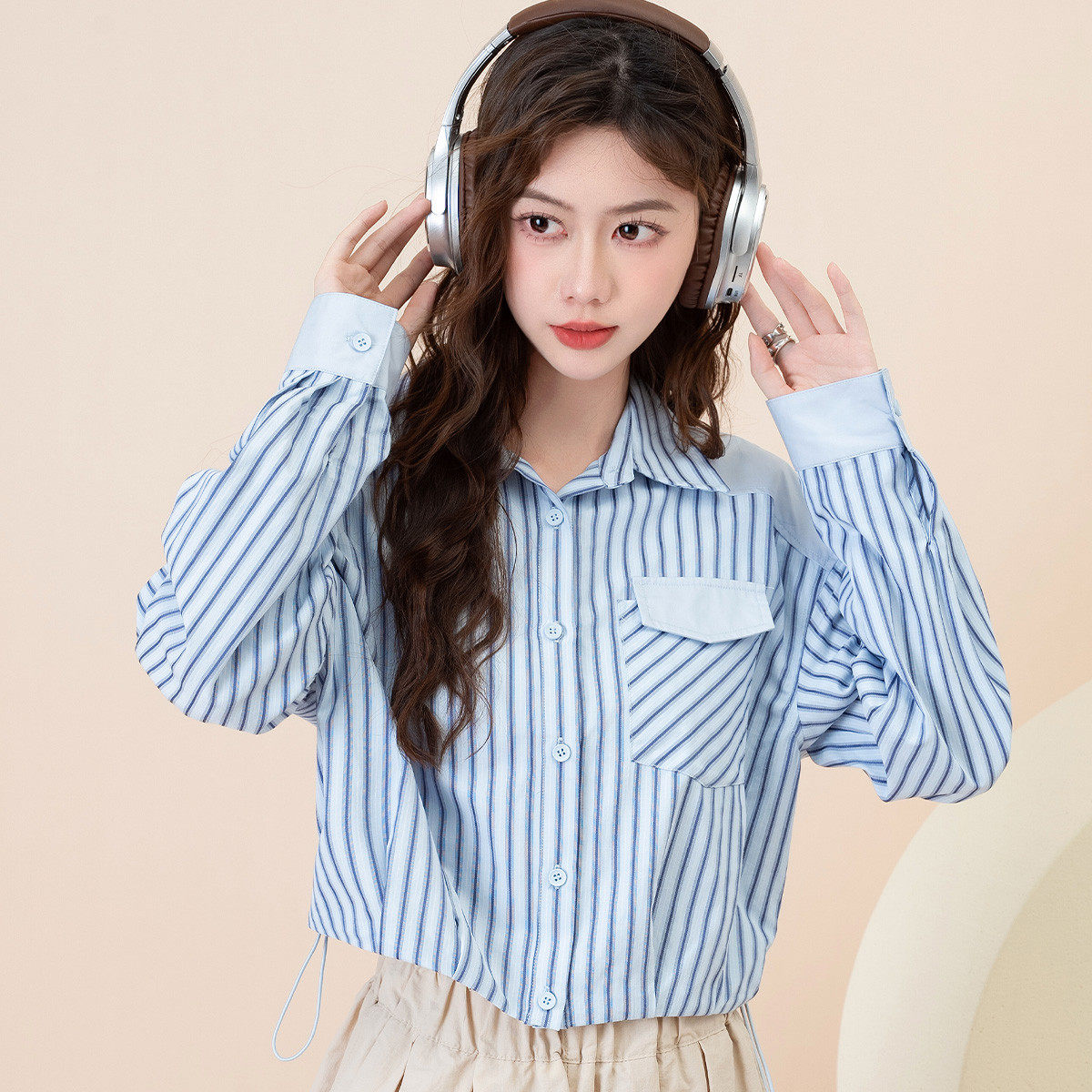 班尼路短款条纹衬衫女高级感撞色衬衫时尚下摆抽绳长袖上衣女J