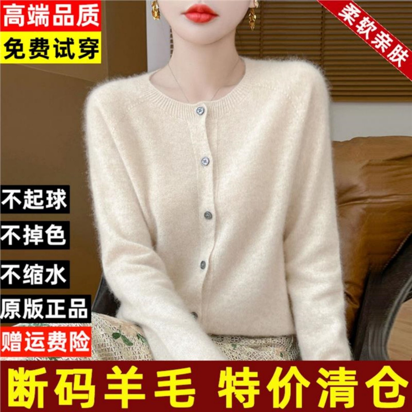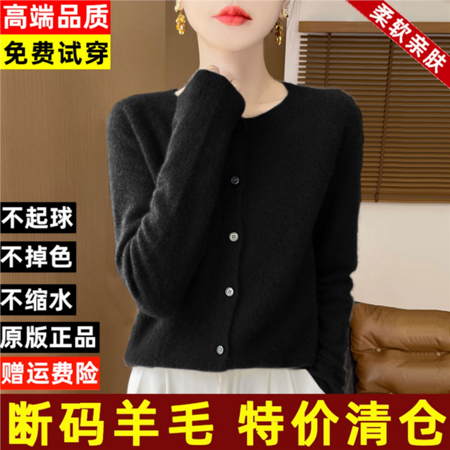 高级感柔软100羊毛圆领针织开衫外套女春秋新款宽松短款毛衣外搭