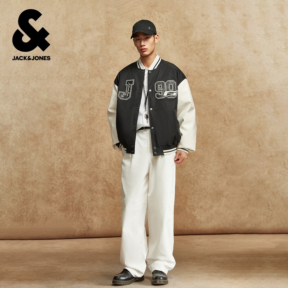 杰克琼斯男装冬季棉衣2025年新款PU拼接黑白字母刺绣棒球服外套