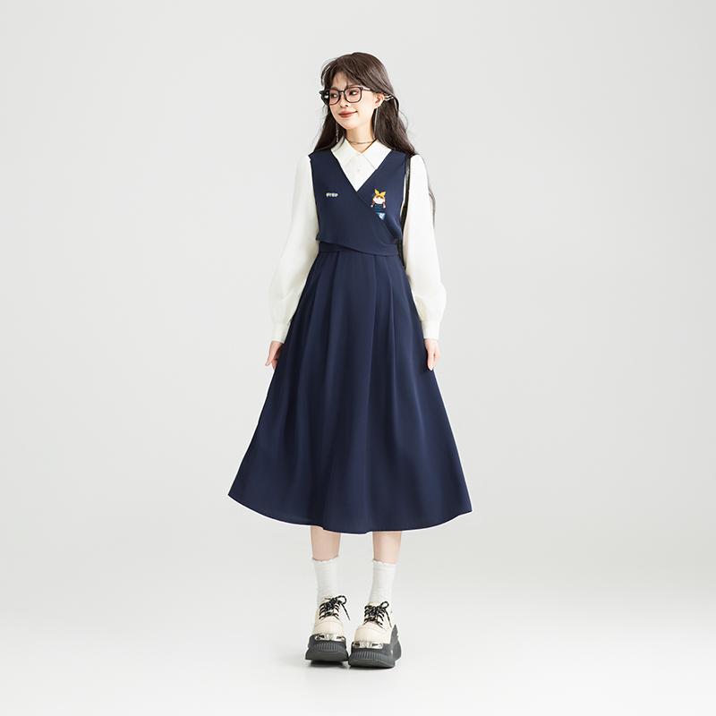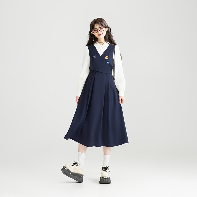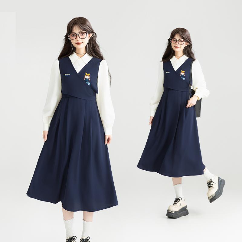 KEIKO 学院风假两件连衣裙25春季通勤气质收腰显瘦A字长裙衬衫裙