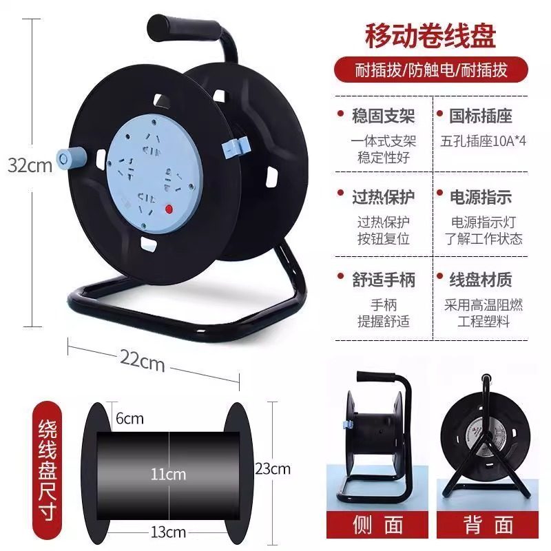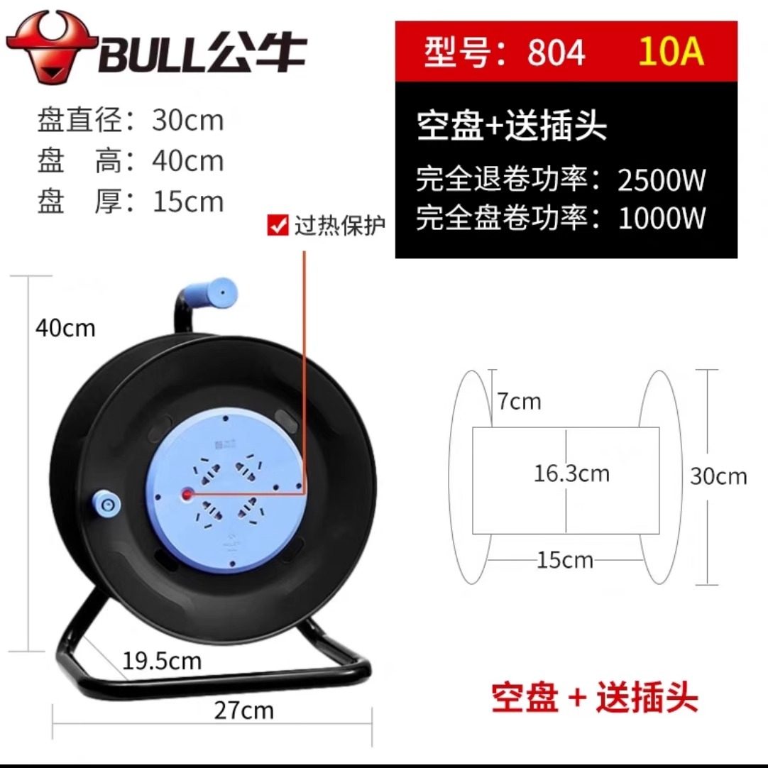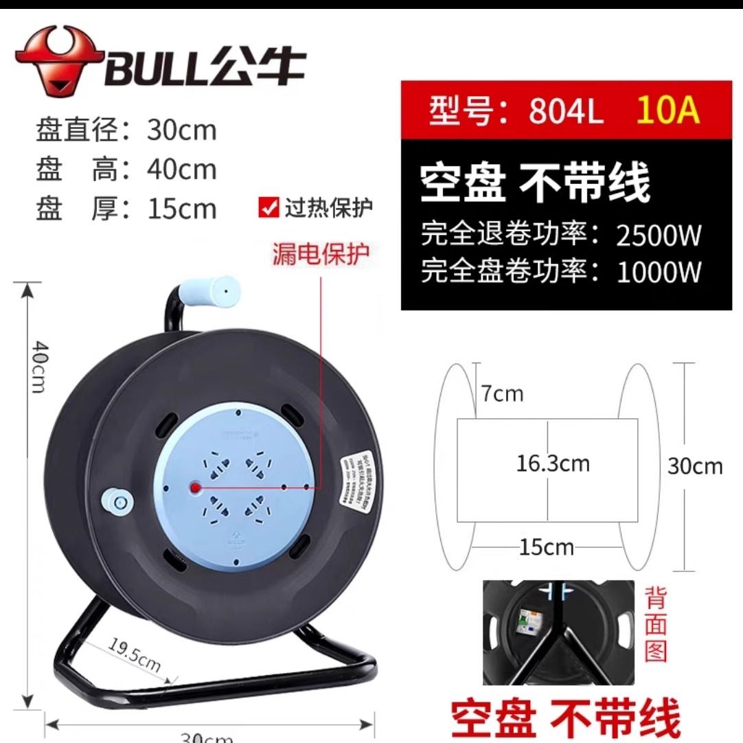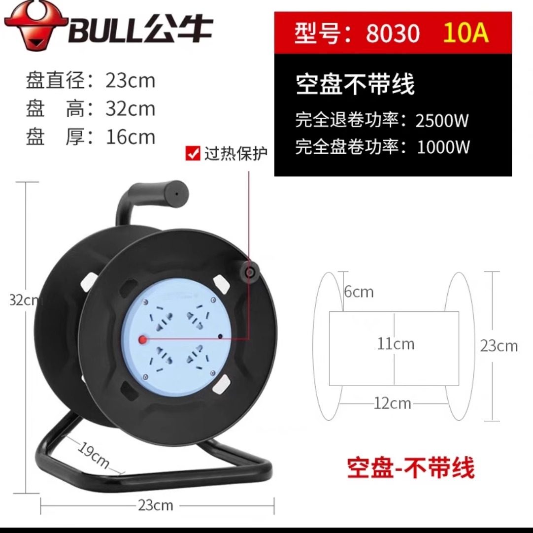 公牛卷线盘GN-8030空盘移动电缆绕线盘线滚子30/50/100米收线盘