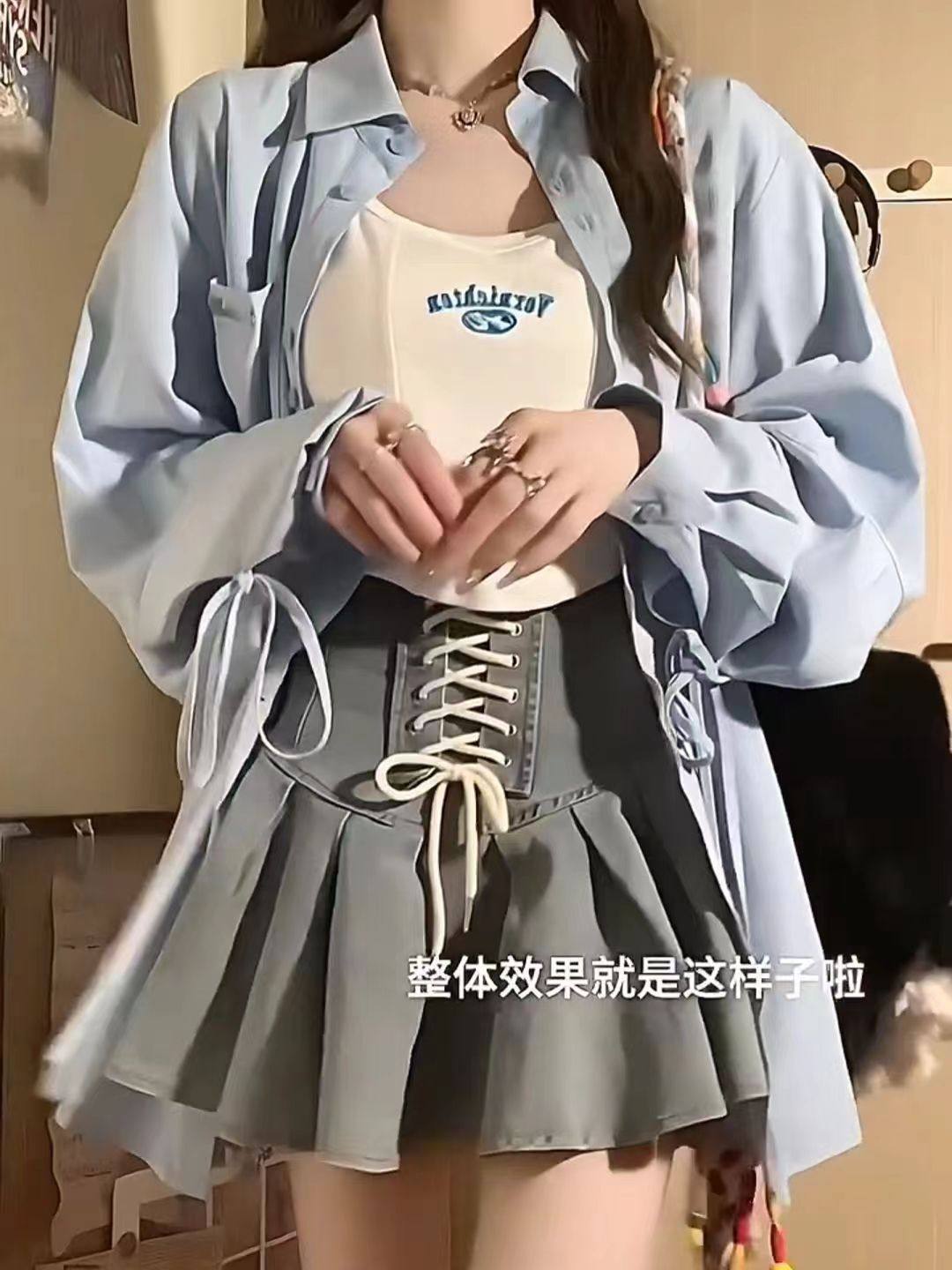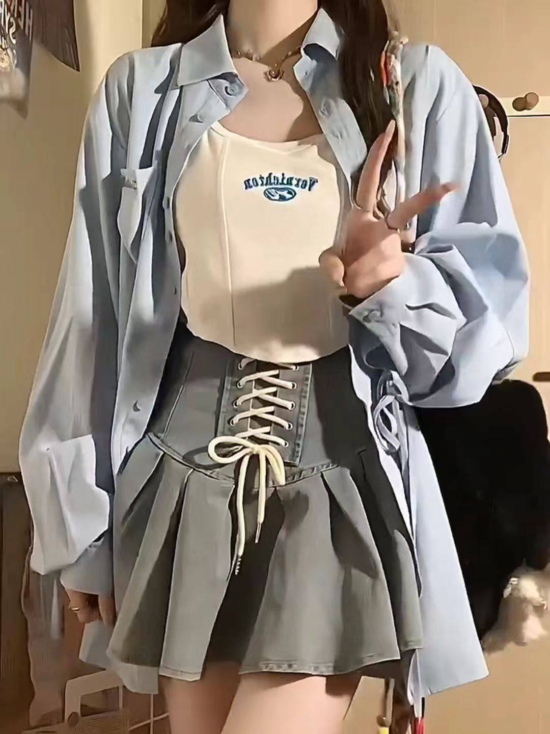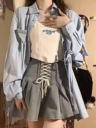 美式绑带百褶牛仔短裙字母刺绣吊带背心绑带防晒衬衫三件套套装女