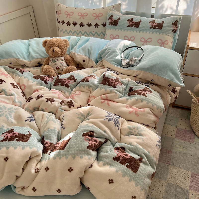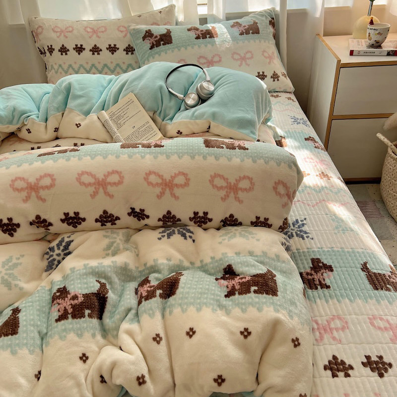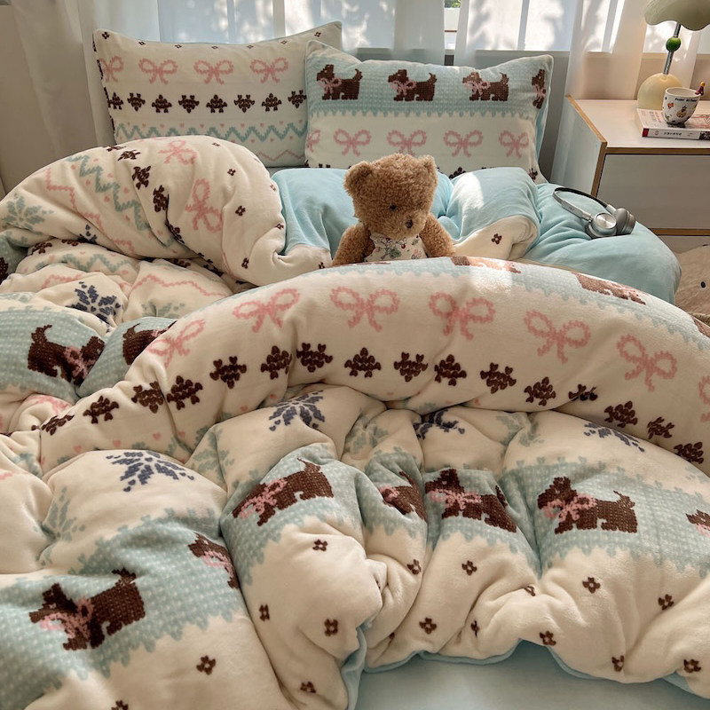ins卡通小狗秋冬加厚保暖牛奶绒四件套被套法兰珊瑚绒床上用品