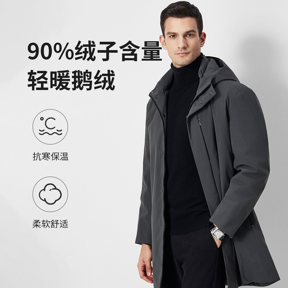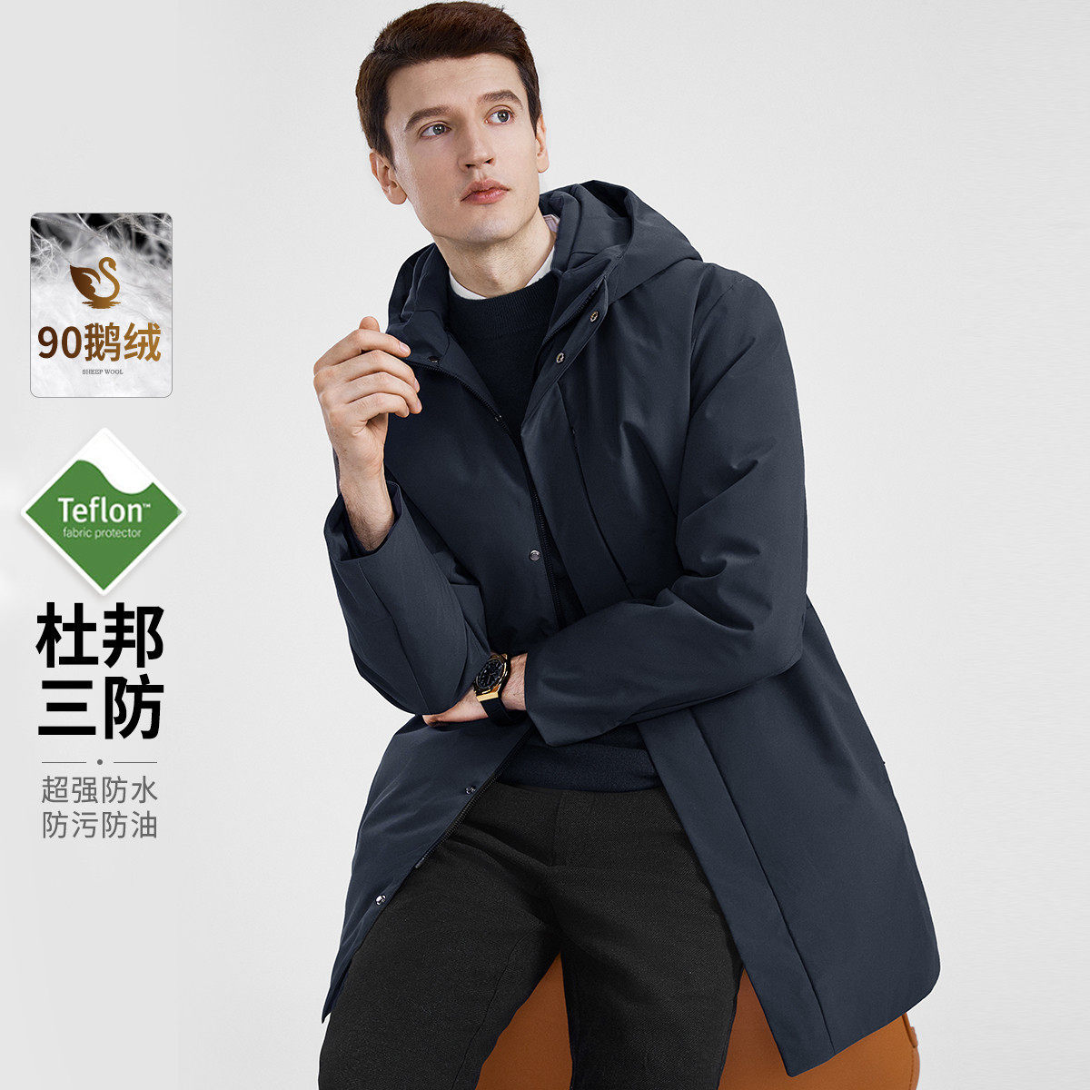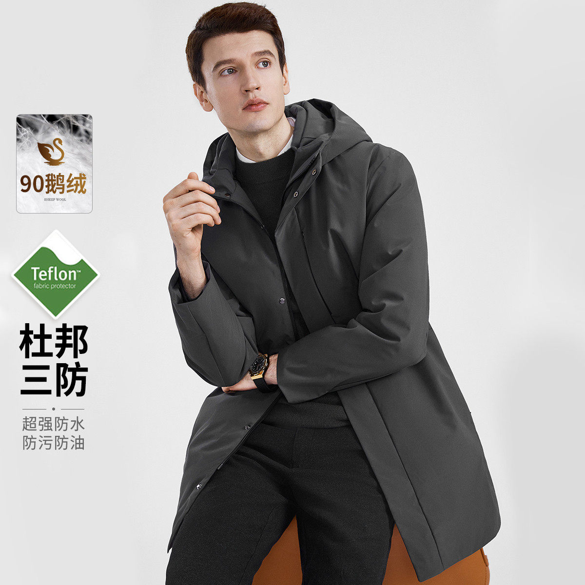 杉杉冬90鹅绒三防商务休闲连帽中长款爸爸装风衣防泼水男士羽绒服