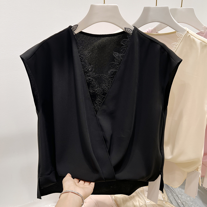 2025新款韩国气质宽松纯色V领刺绣钩花拼接无袖雪纺衬衫女夏季