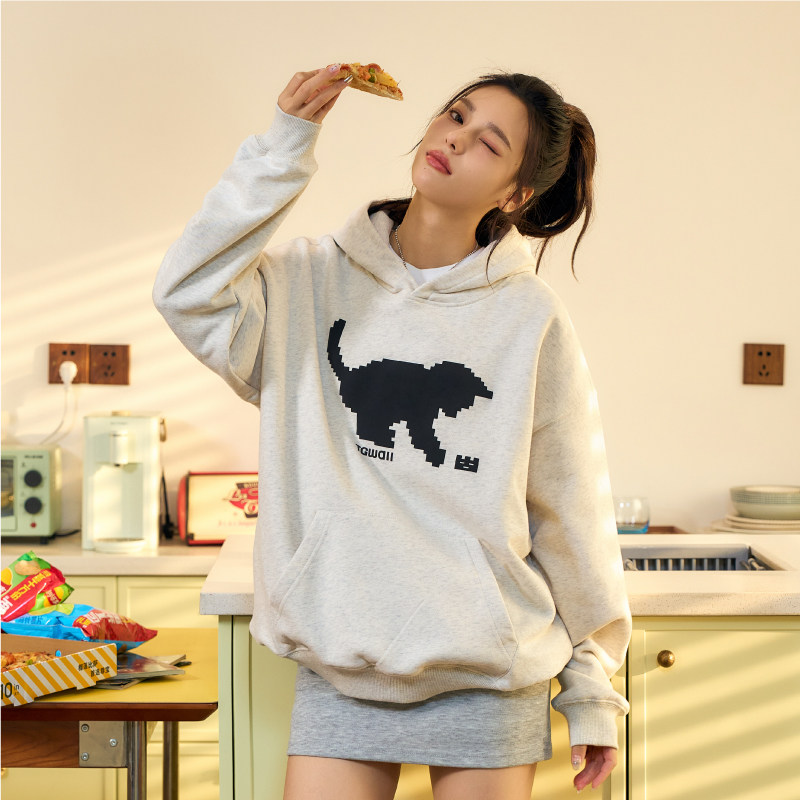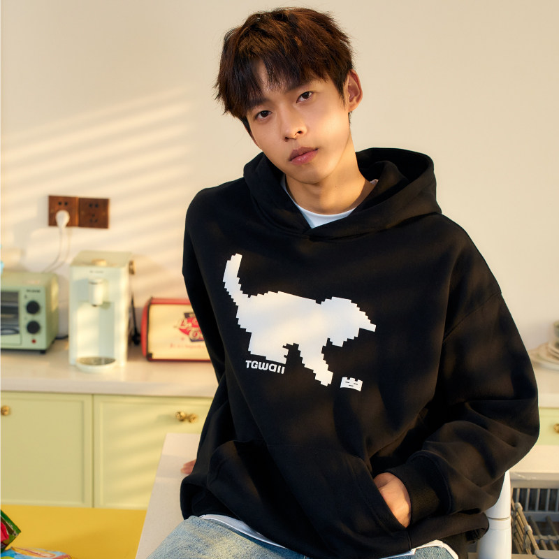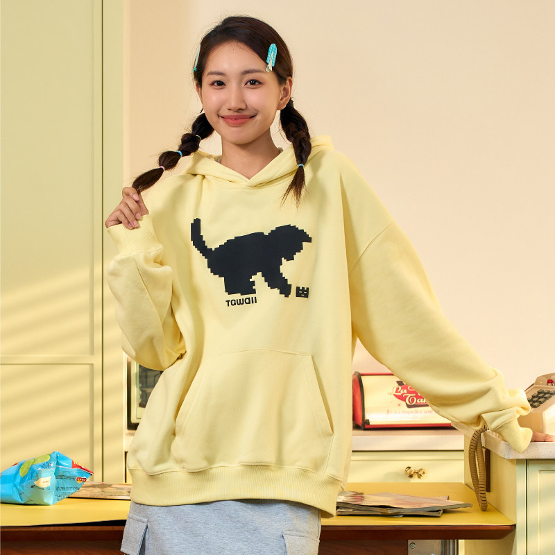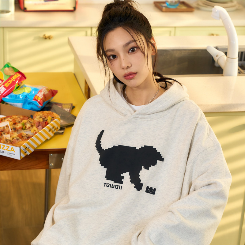 TGWALL「像素猫」发泡趣味印花国潮秋冬情侣休闲宽松连帽衫卫衣男
