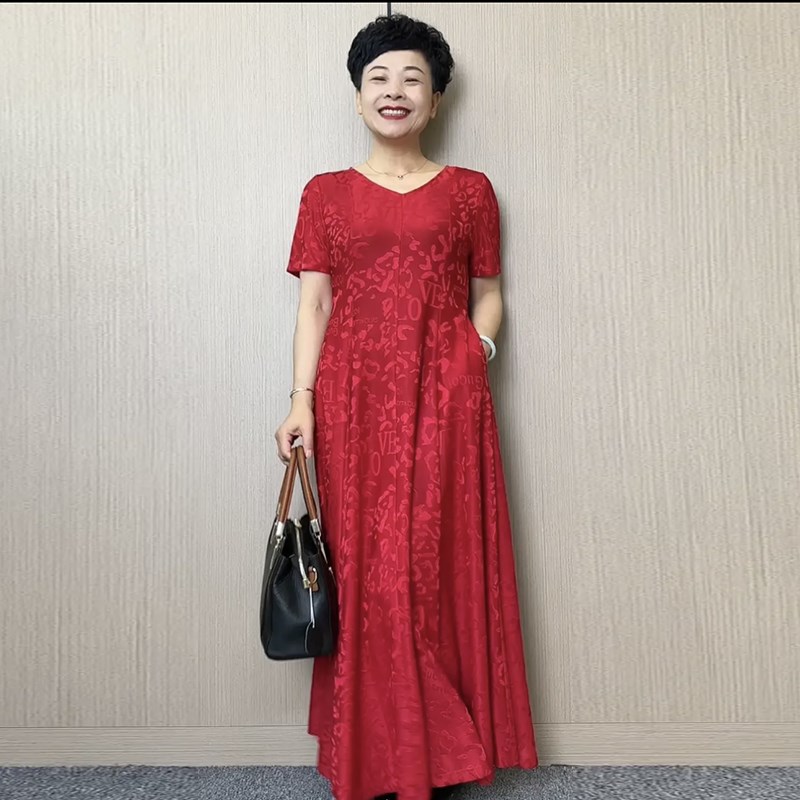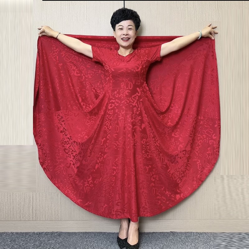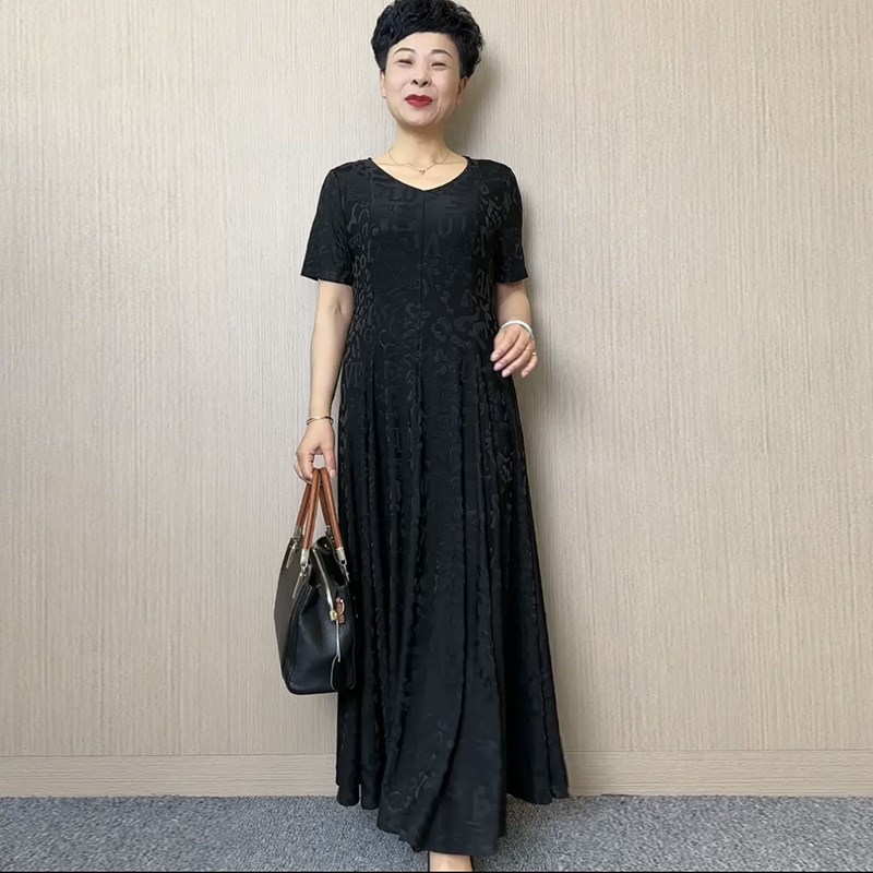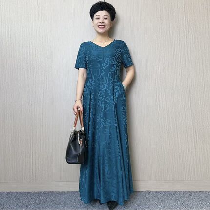 高端妈妈连衣裙夏季新短袖提花十片拼接不断腰大摆裙弹性坠感长裙