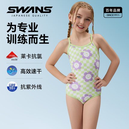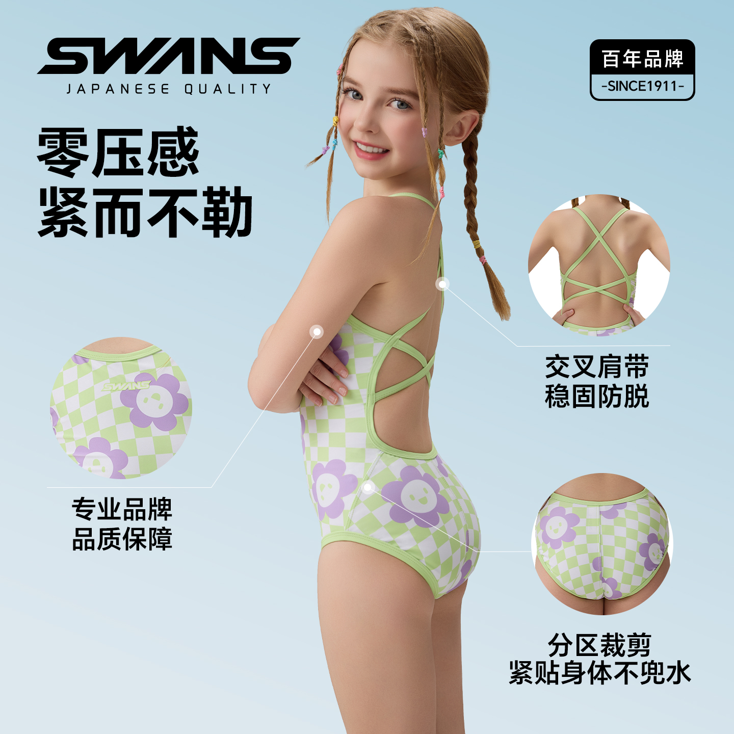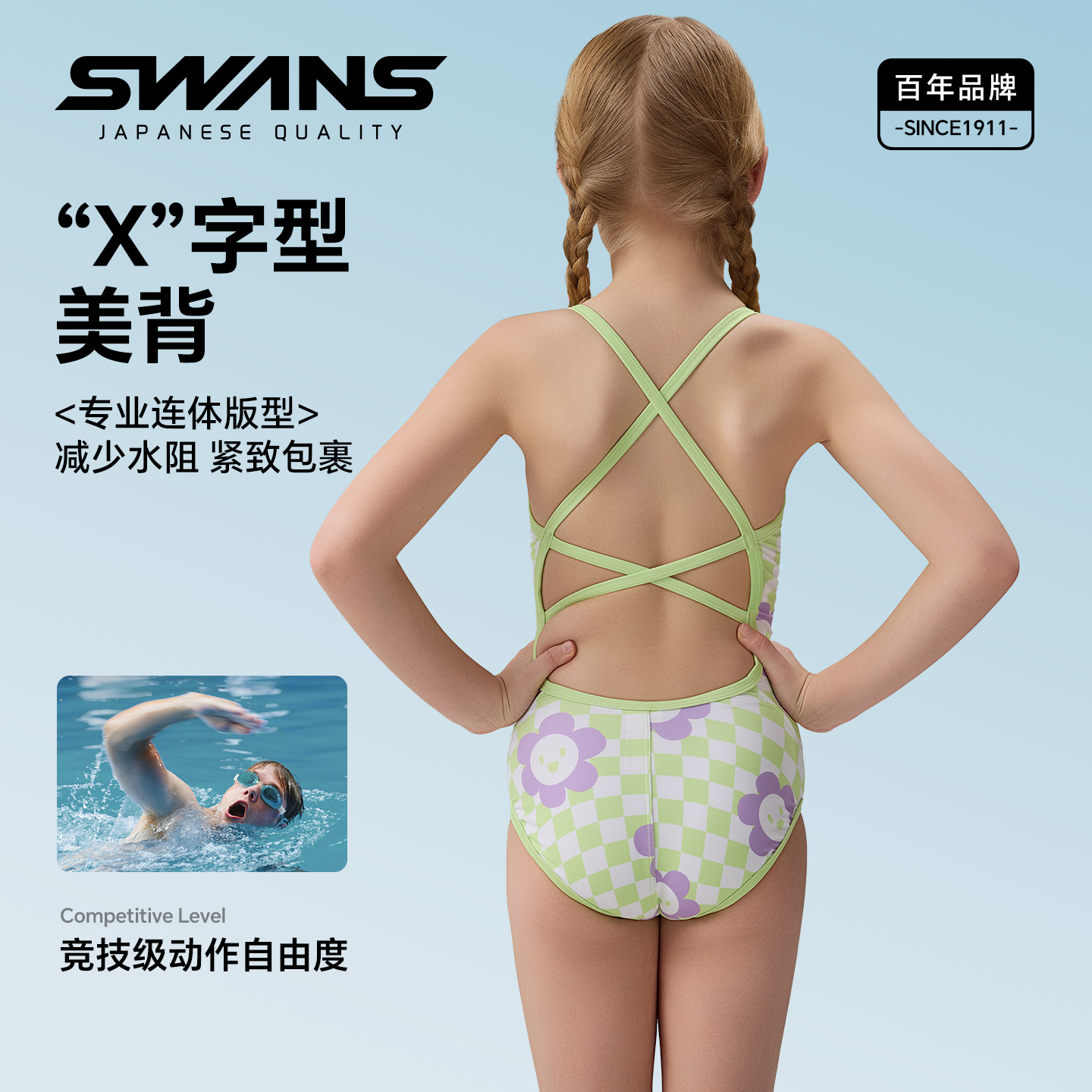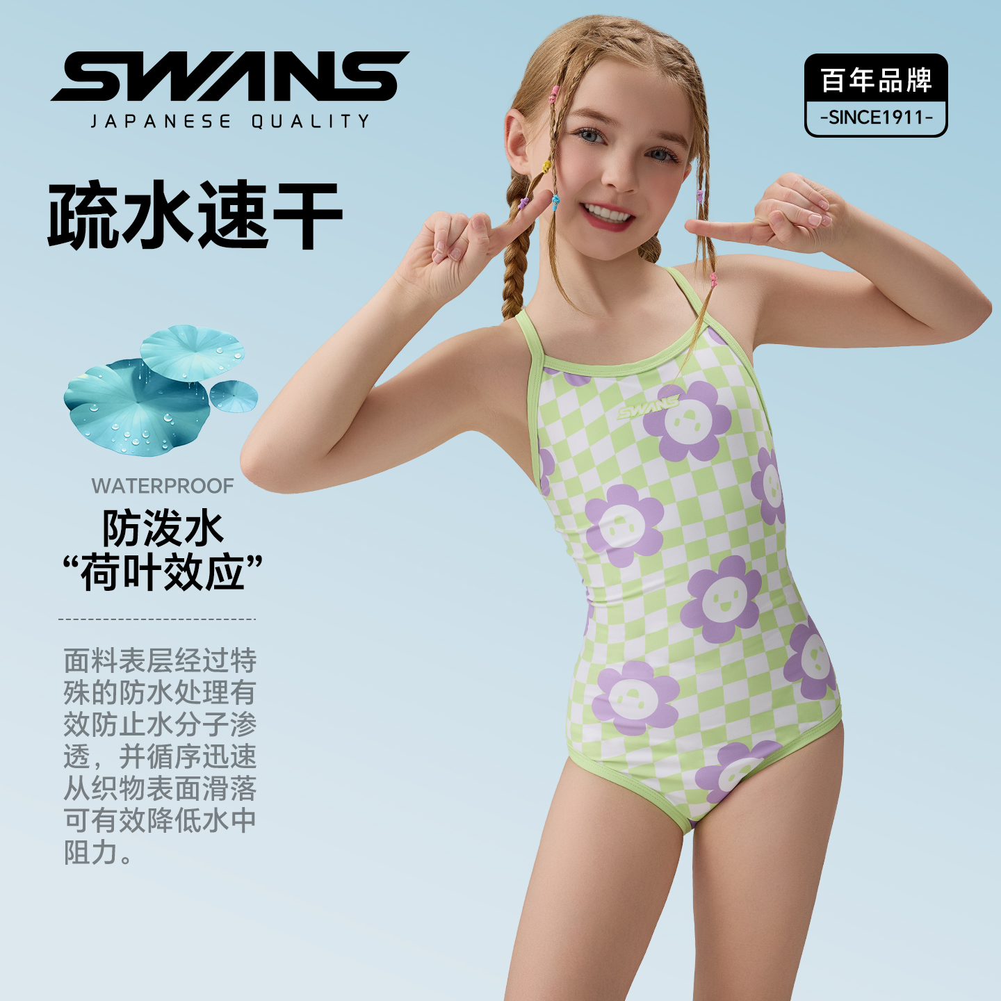 swans儿童泳衣女童新款速干训练游泳连体三角比赛中大童专业游泳