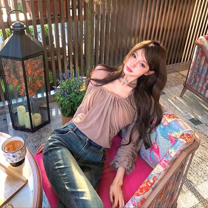 复古高级感褶皱斜肩灯笼长袖雪纺衬衫女春季修身短款气质百搭上衣