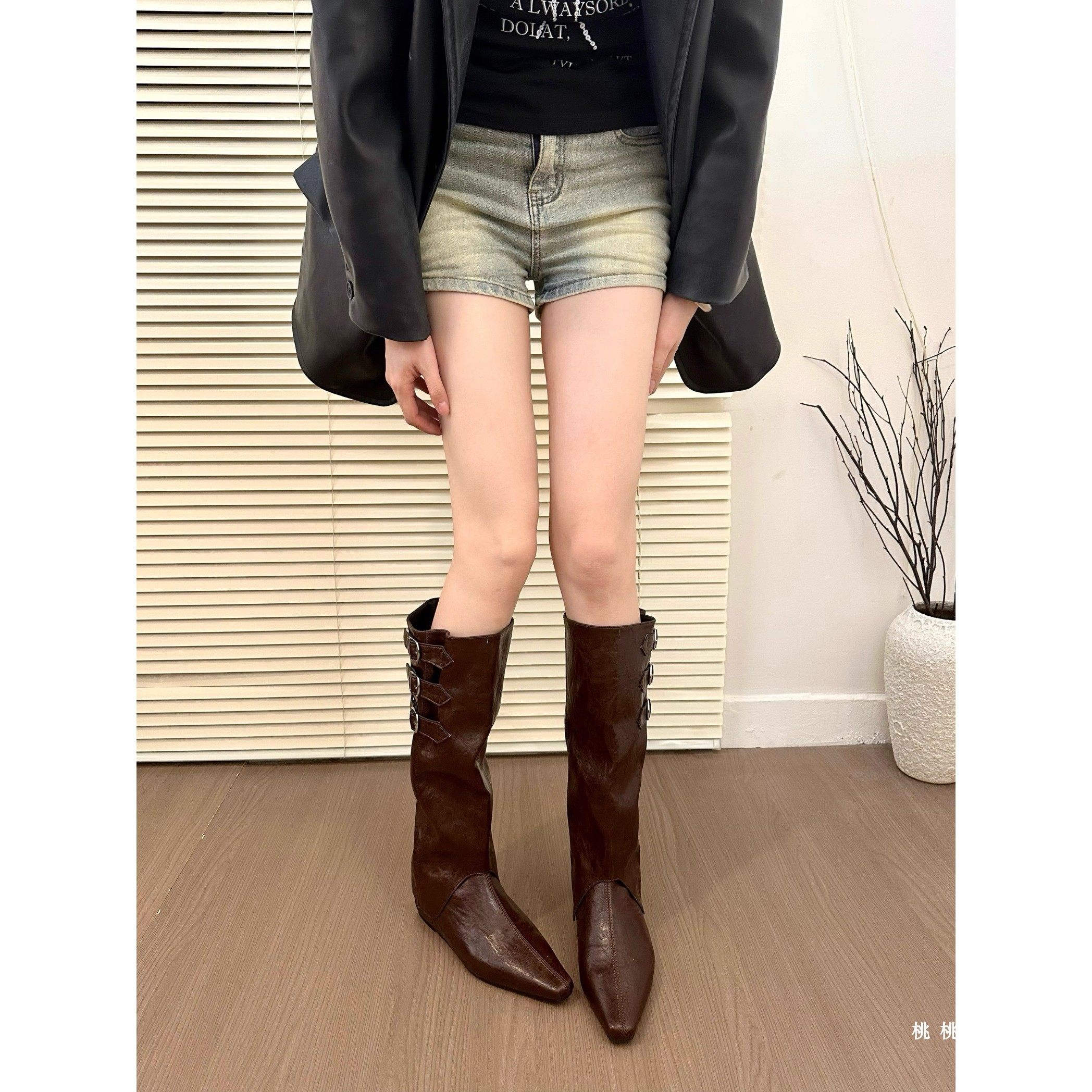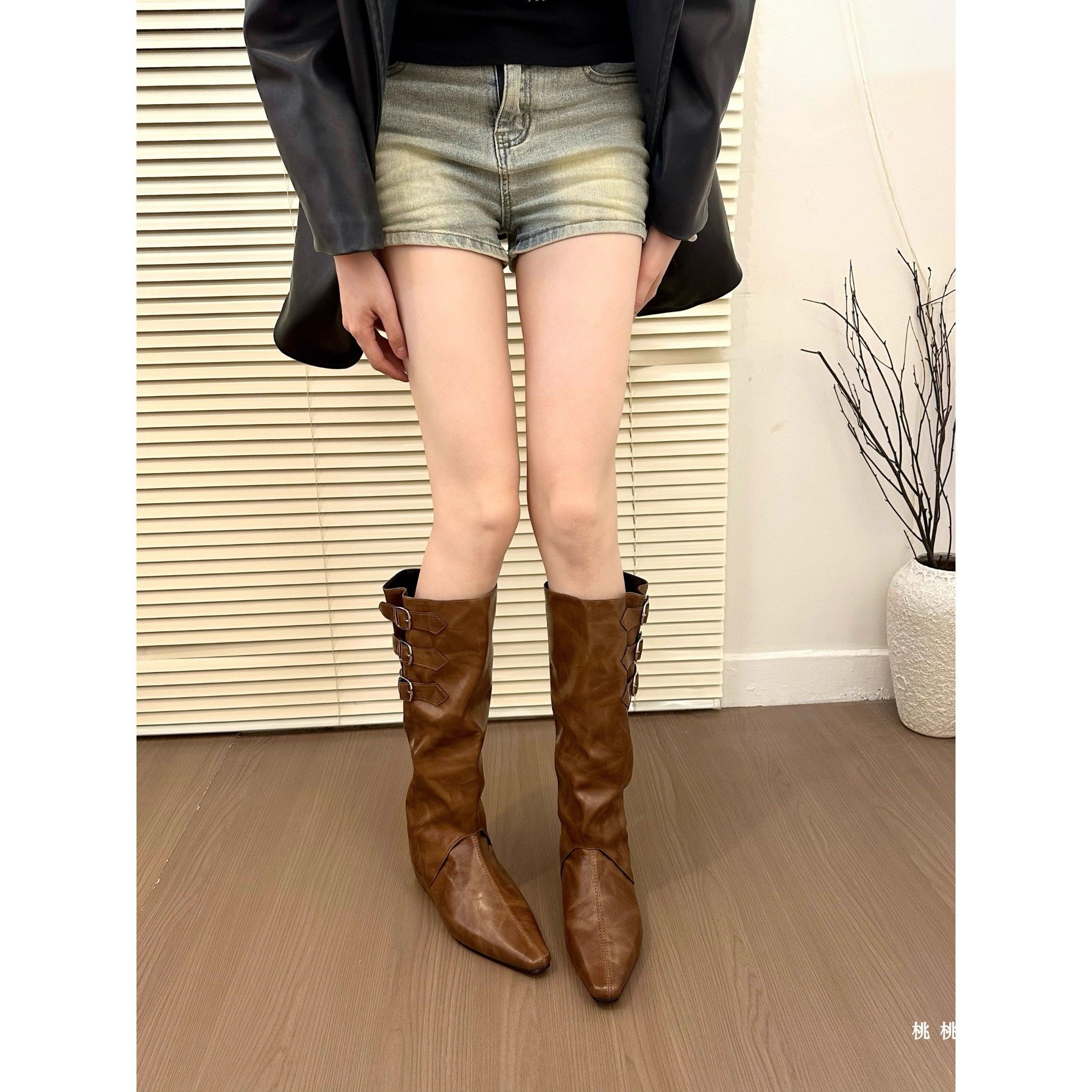 内增高尖头西部牛仔靴女鞋2025新款春秋单靴棕色美拉德中筒长靴子