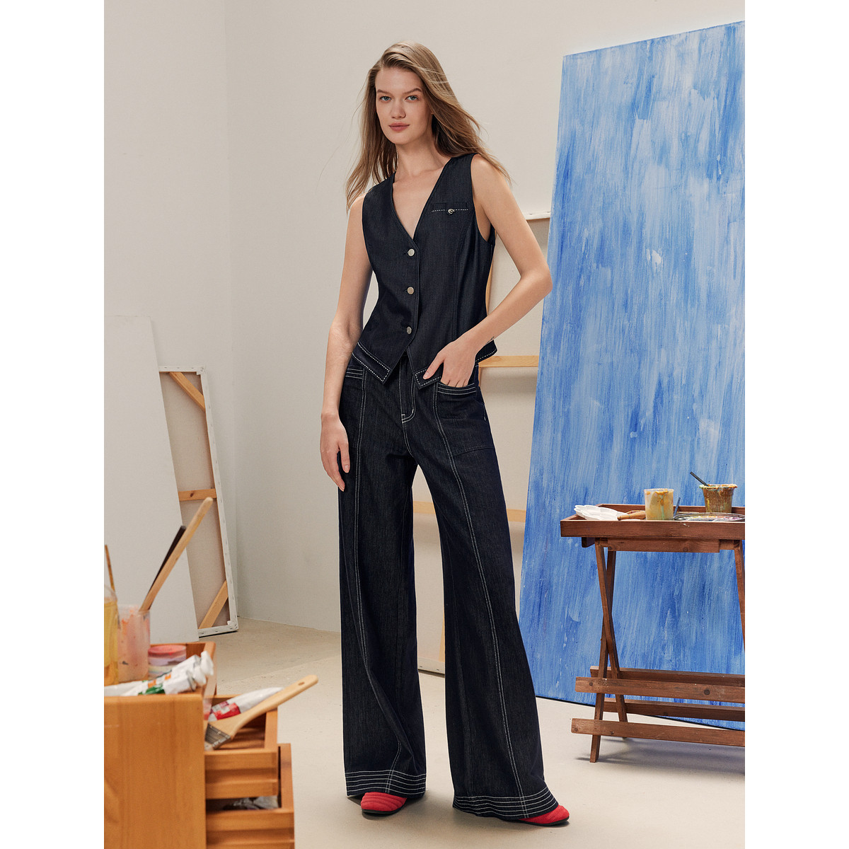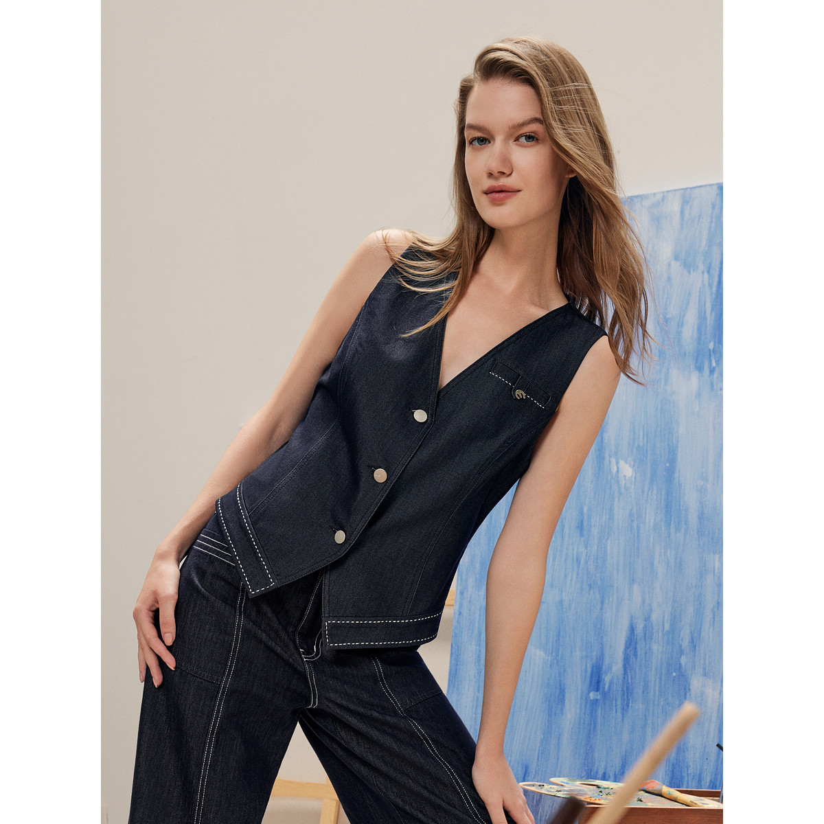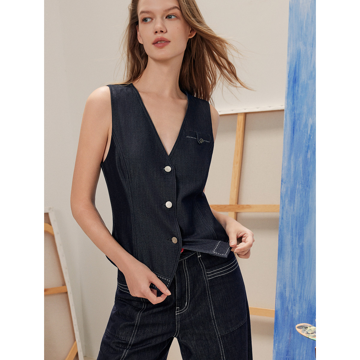 ELLE摩登设计感无袖V领马甲女2025秋季新款收腰通勤小众牛仔马夹