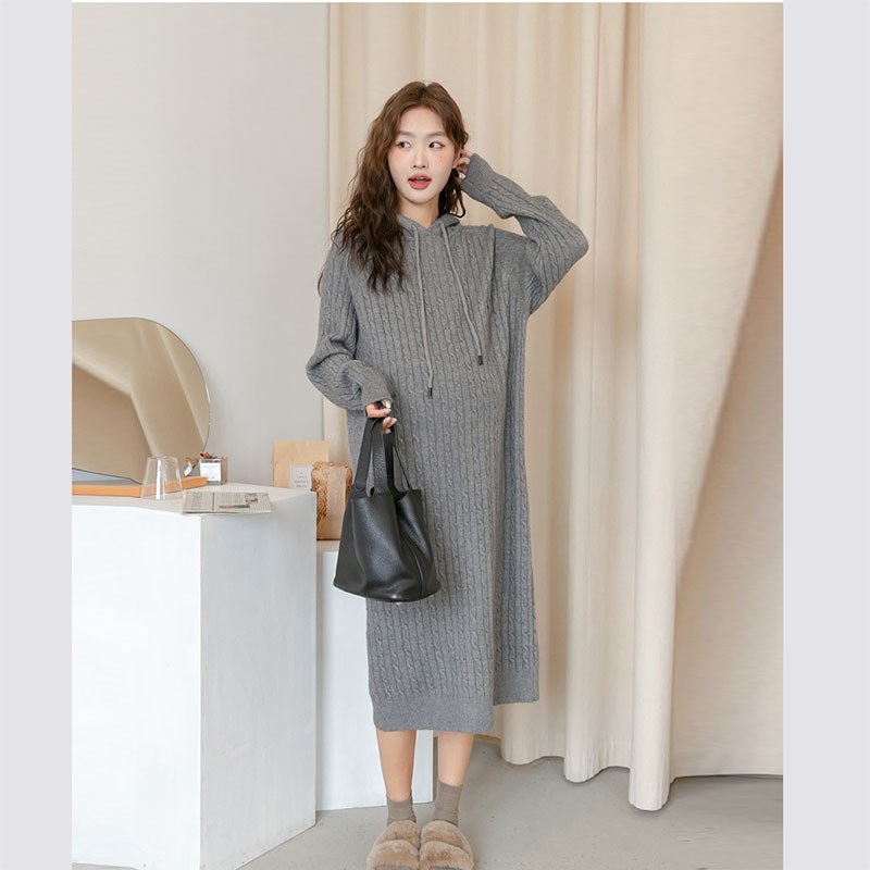 孕妇装秋冬季连衣裙慵懒风休闲宽松连帽针织裙温T柔风潮妈直筒裙