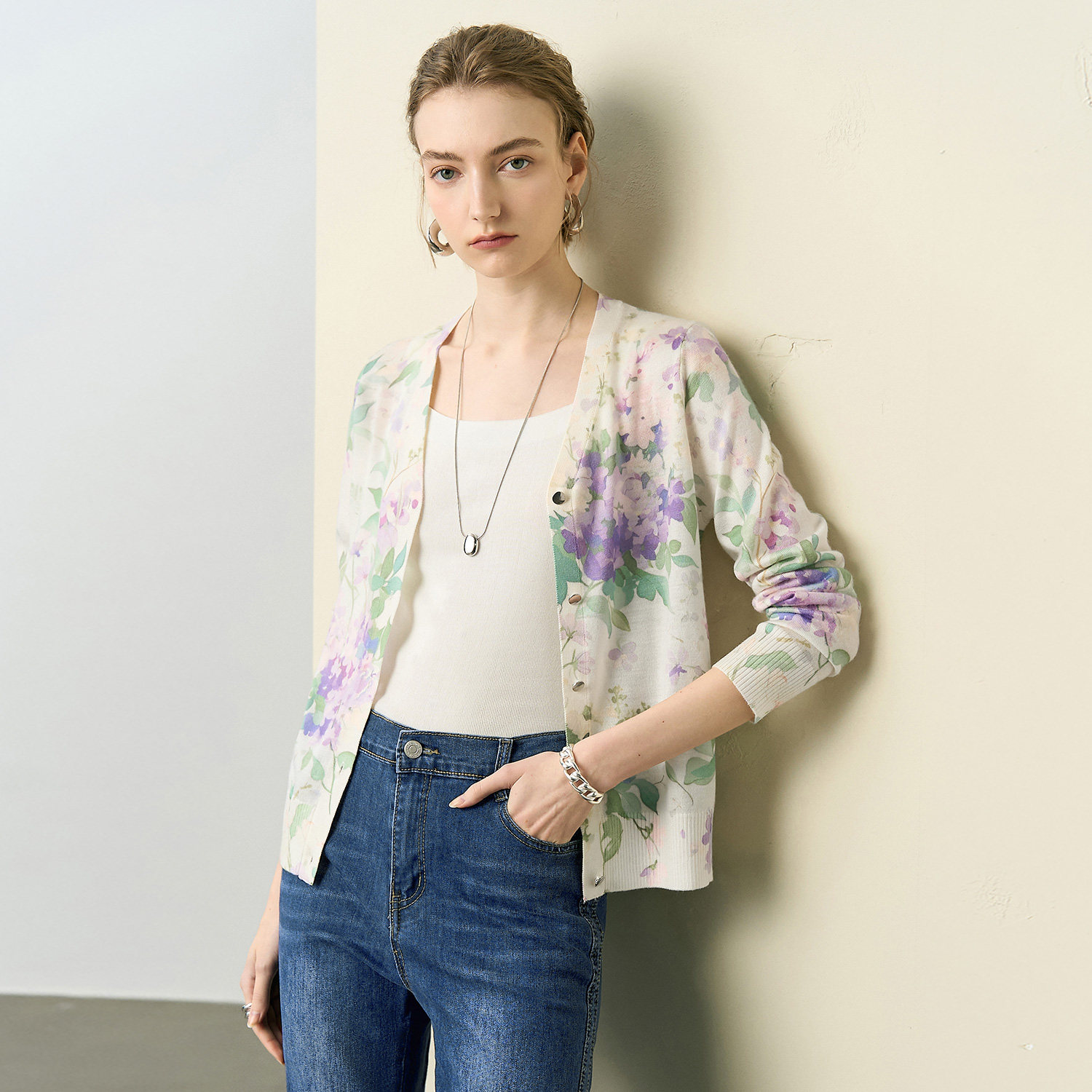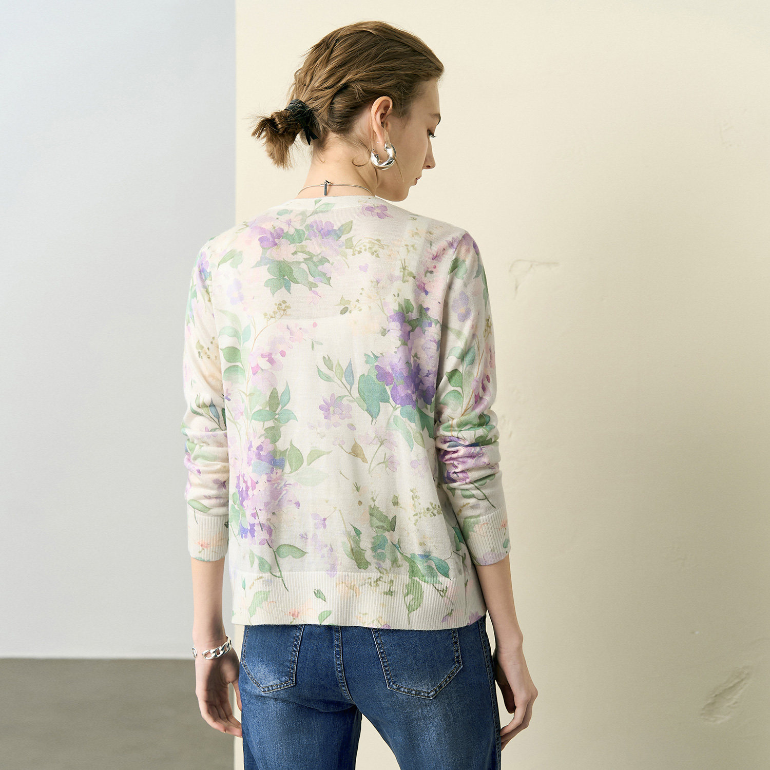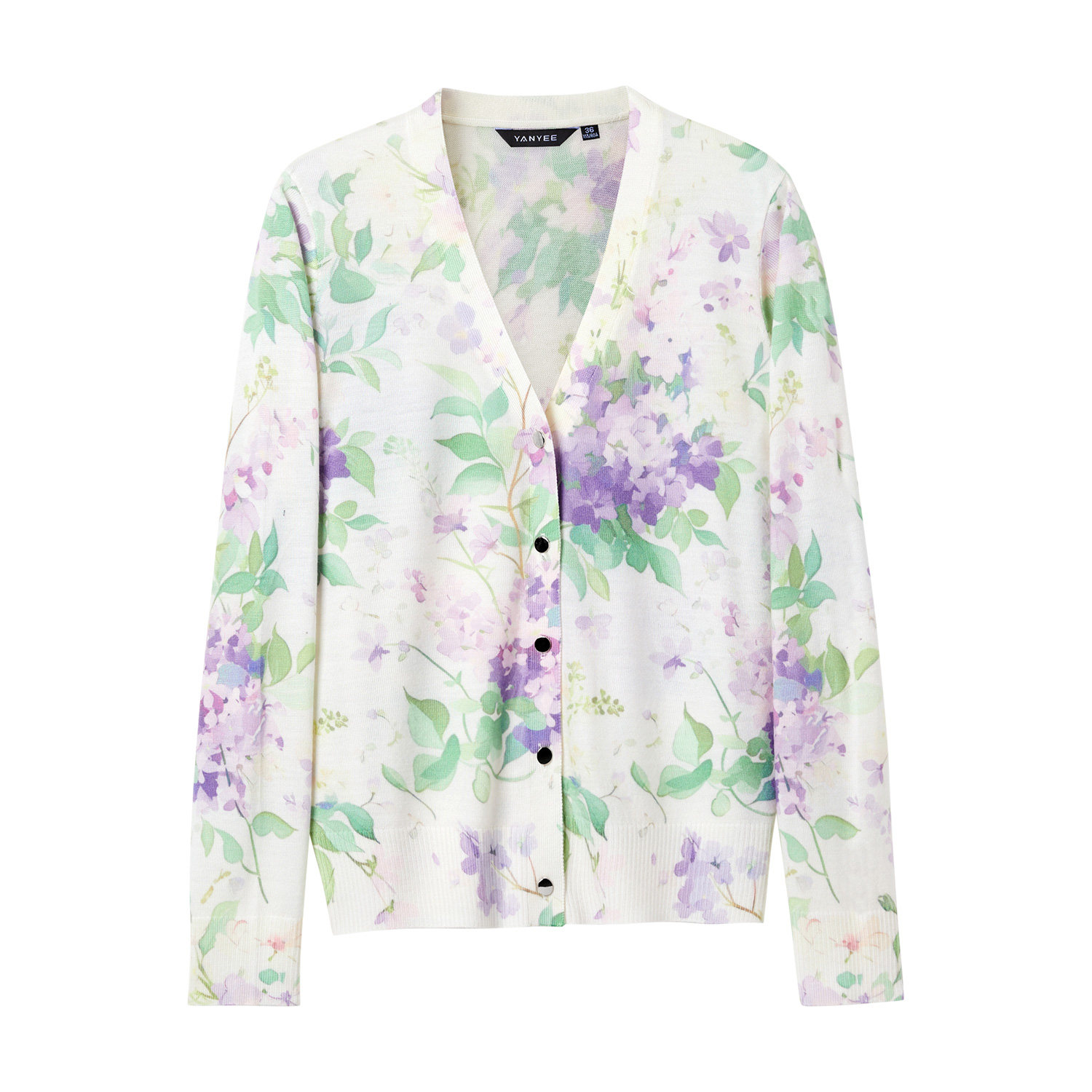 颜域复古印花V领针织衫女2026春季新款优雅长袖上衣气质开衫外套