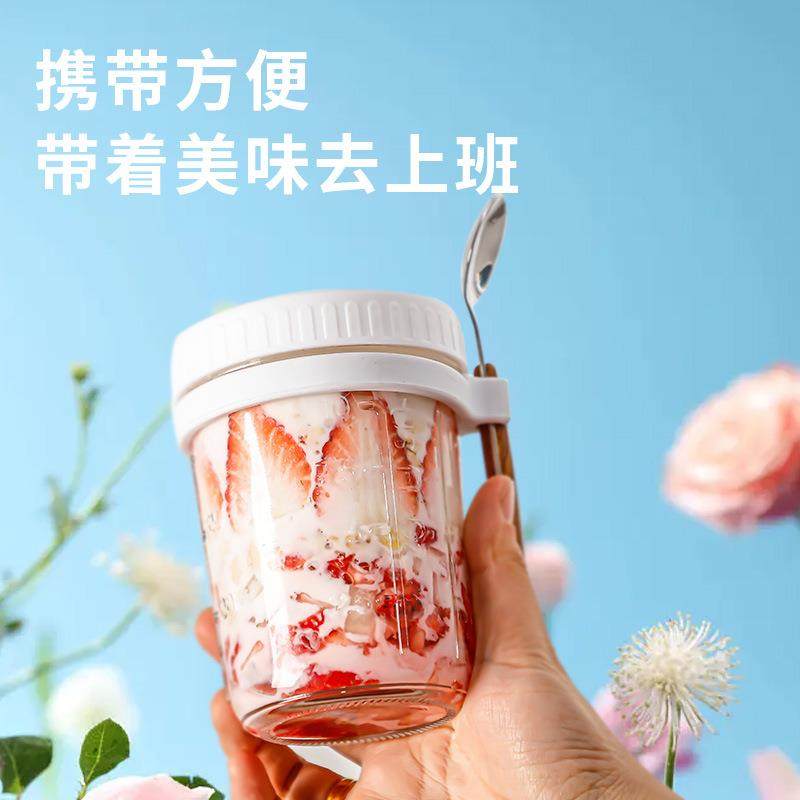 玻璃隔夜燕麦酸奶杯便携早餐杯牛D奶玻璃杯带勺子带盖刻度杯套装
