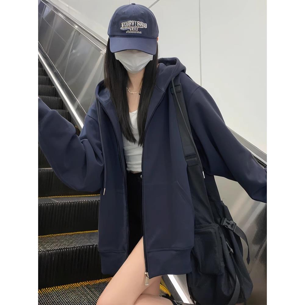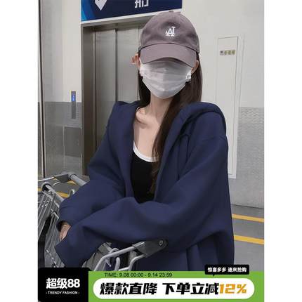 连帽卫衣外套女开衫早秋2025新款爆款藏蓝色秋冬加绒加厚宽松上衣