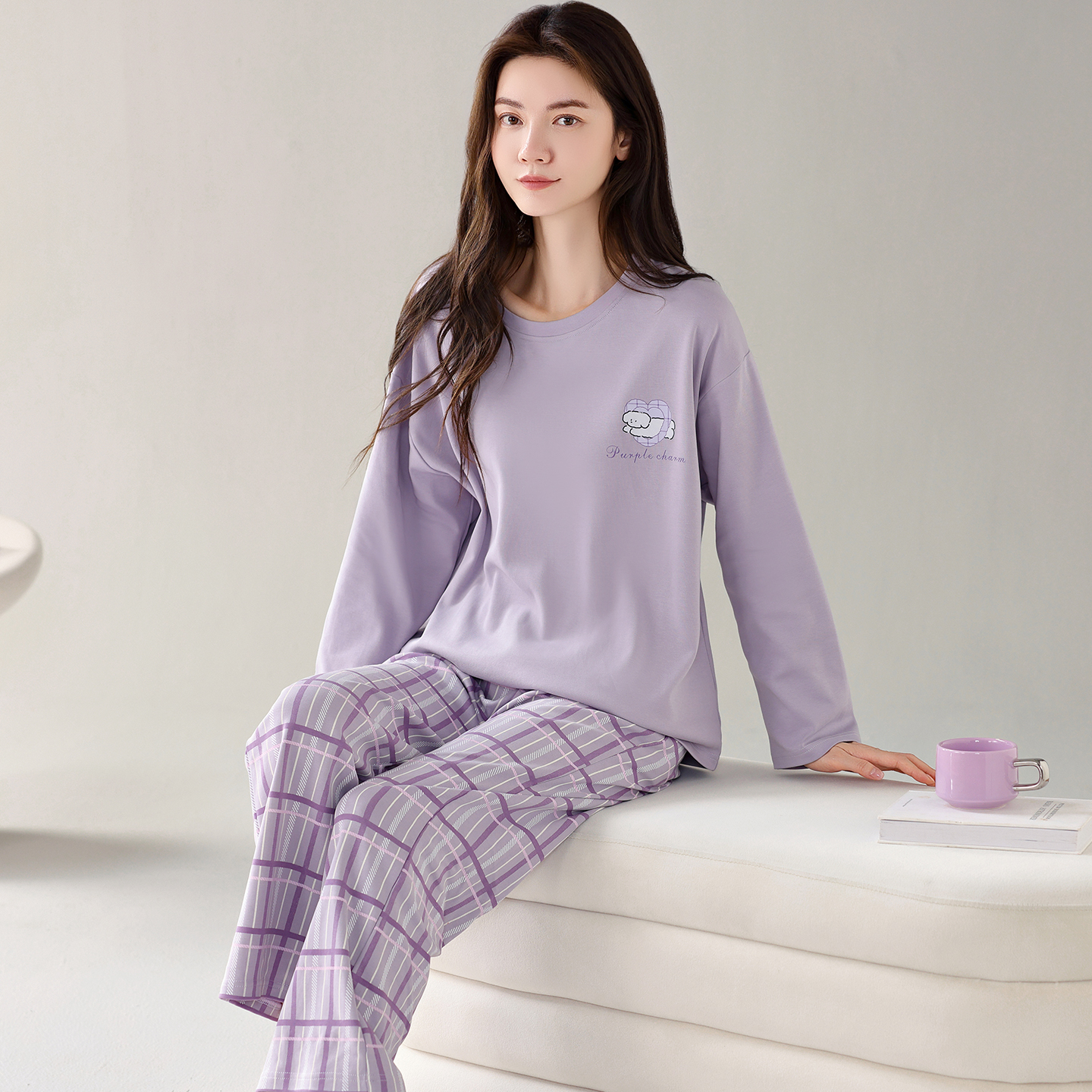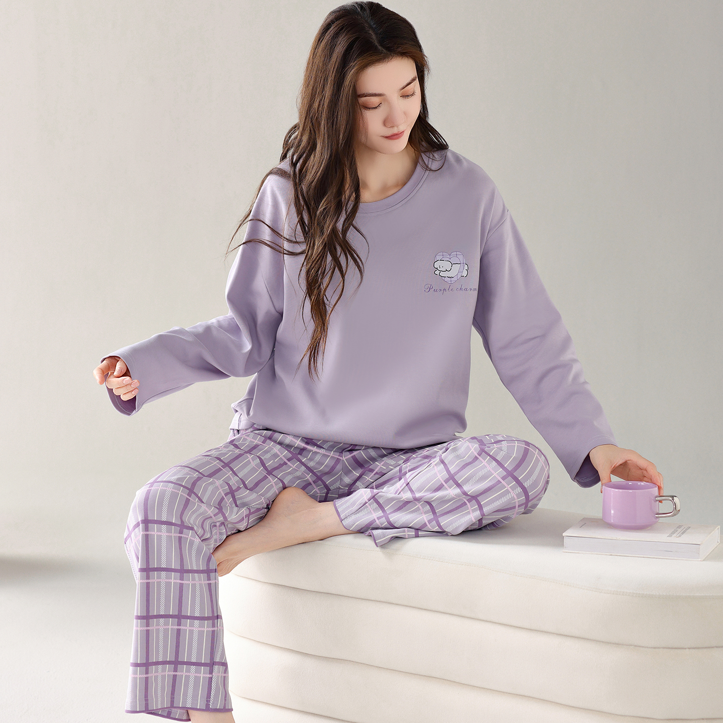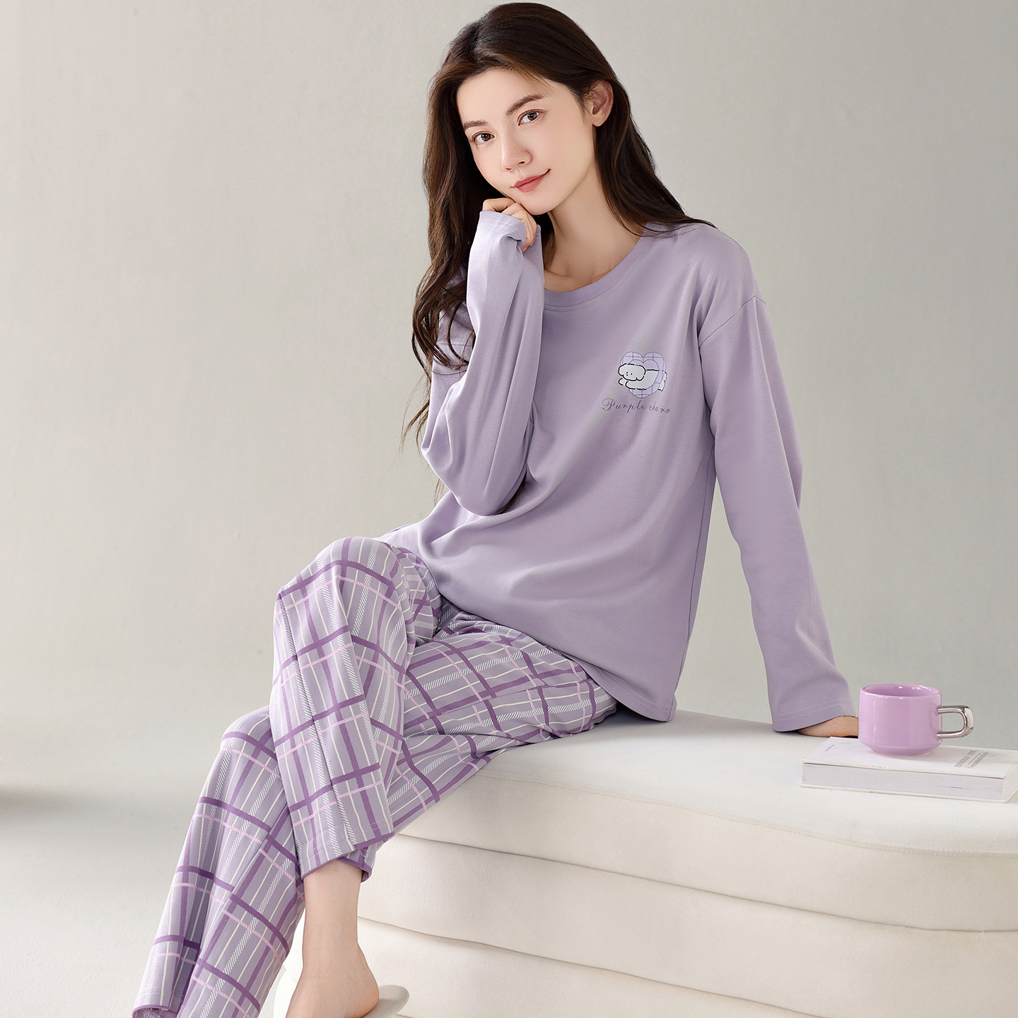 宜而爽条纹纯棉女士睡衣套装春秋季印花长袖长裤休闲家居服可外穿
