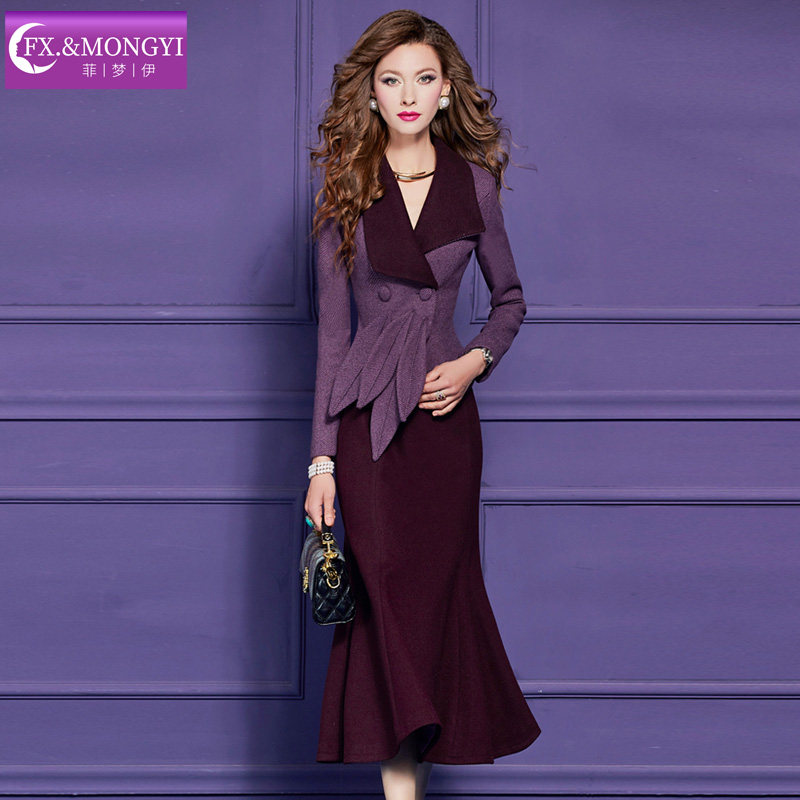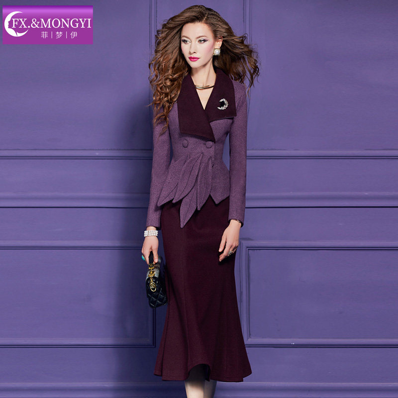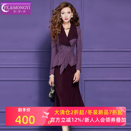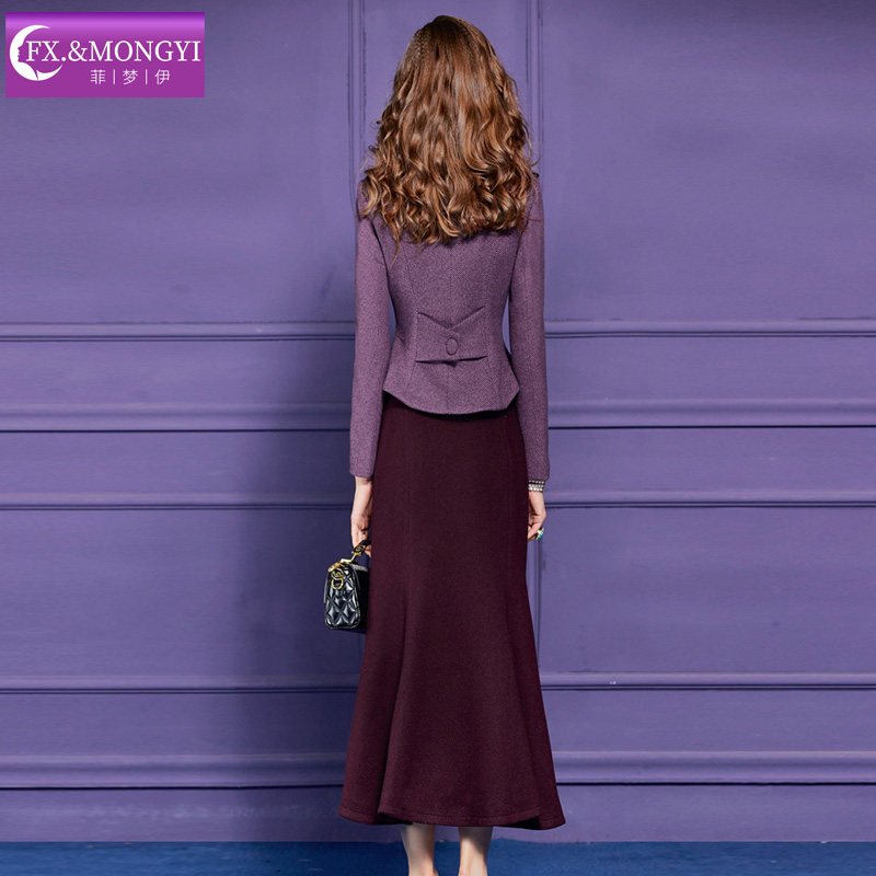 菲梦伊复古名媛时尚套装女冬季设计感翻领修身毛呢外套鱼尾半身裙