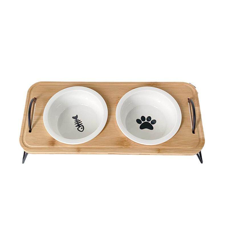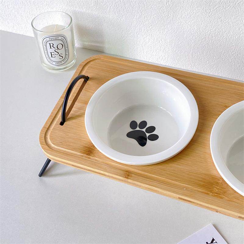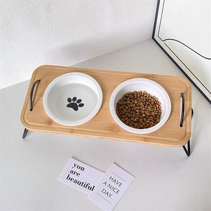 猫碗双碗猫食盆陶瓷狗饭盆猫咪喂水碗平口狗粮碗防打翻宠物碗木架