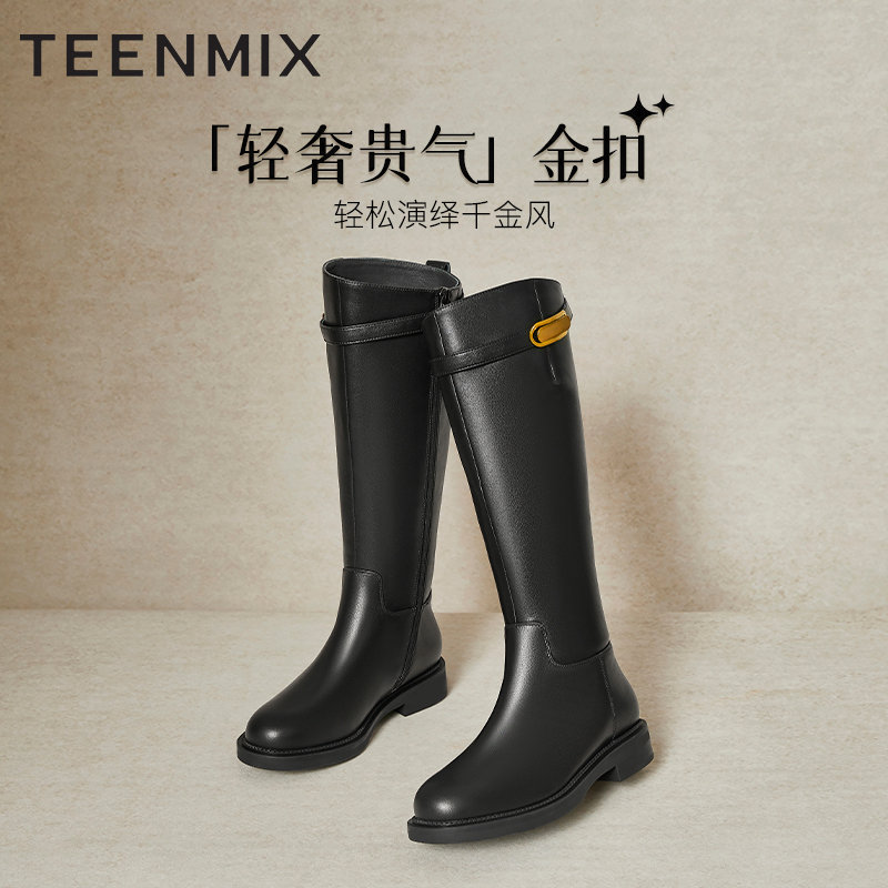 天美意千金靴复古厚底加绒骑士靴长靴女高筒时装靴皮靴冬新款
