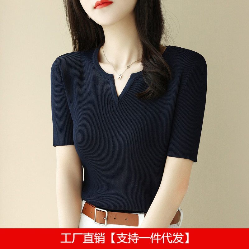 夏季小众v领修身时尚坑条针织衫新款气质短袖百搭薄款上衣t恤女装