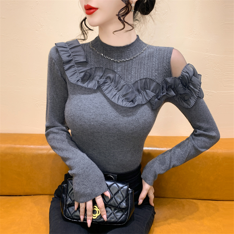 实拍 半高领露肩钉钻荷叶边网纱针织衫拼接秋冬新款打底衫毛衣
