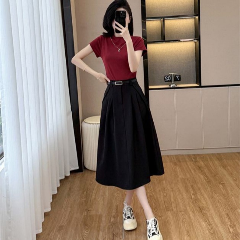 小高领短袖τ桖半身裙两件套女2025夏季新款修身显瘦气质套装