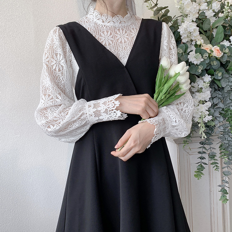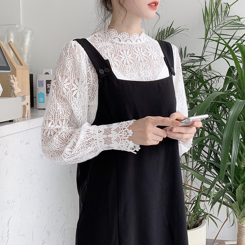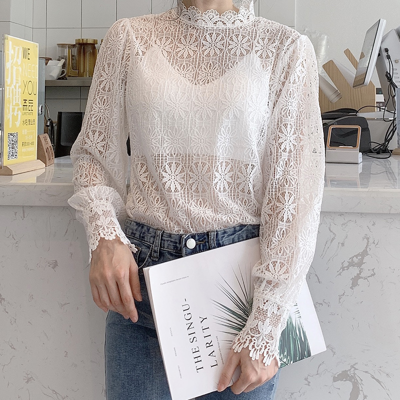 2024秋冬新款女上衣小衫内搭长袖蕾丝衫半高领灯笼袖百搭打底衫
