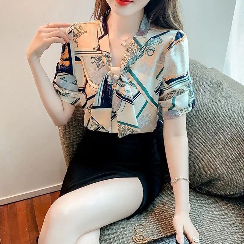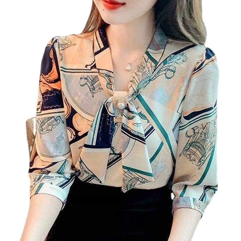 春夏季2023年新款设计感气质衬衣长袖上衣七分袖印花雪纺衬衫