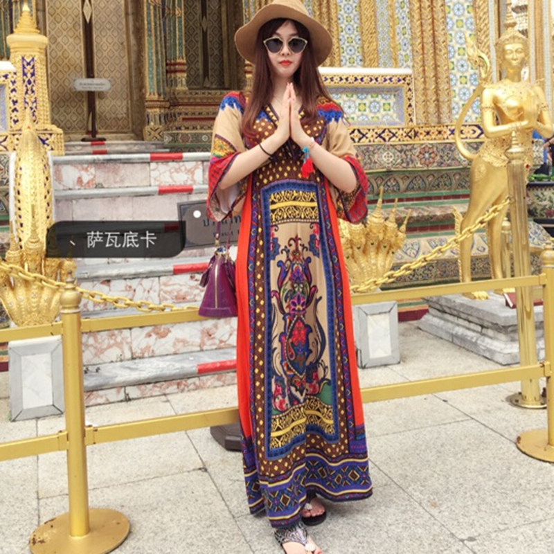 波西米亚印花沙滩长裙海边度假显瘦泰国三亚民族风大码胖mm连衣裙