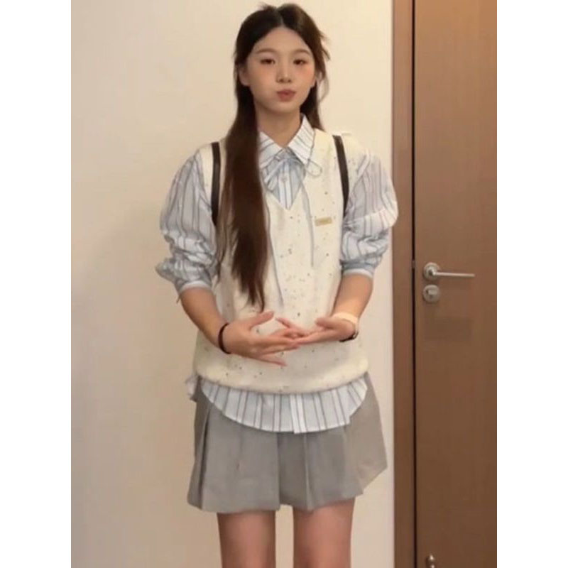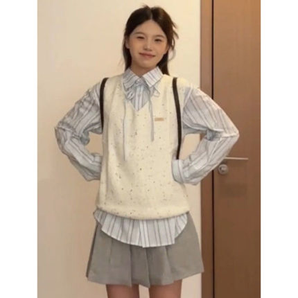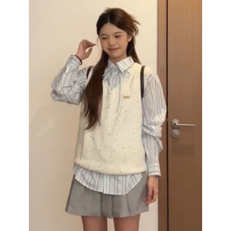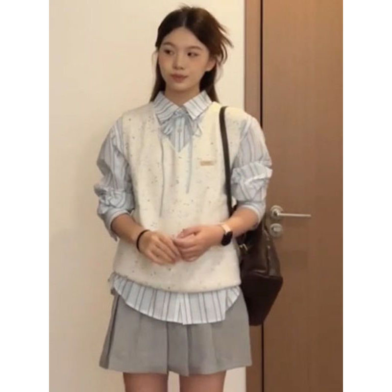学院风v领百搭彩点针织毛衣背心马甲女学生叠穿条纹衬衫两件套装