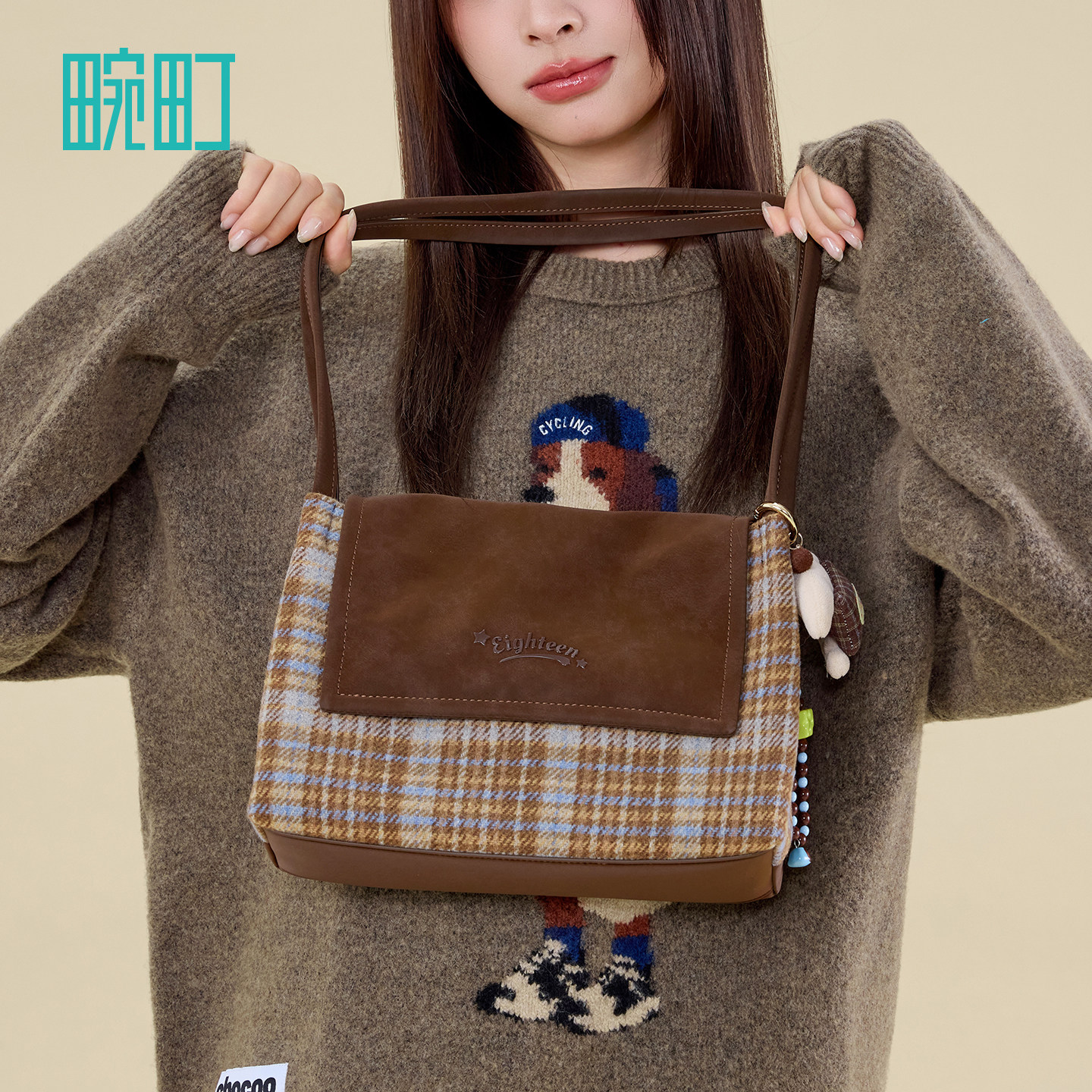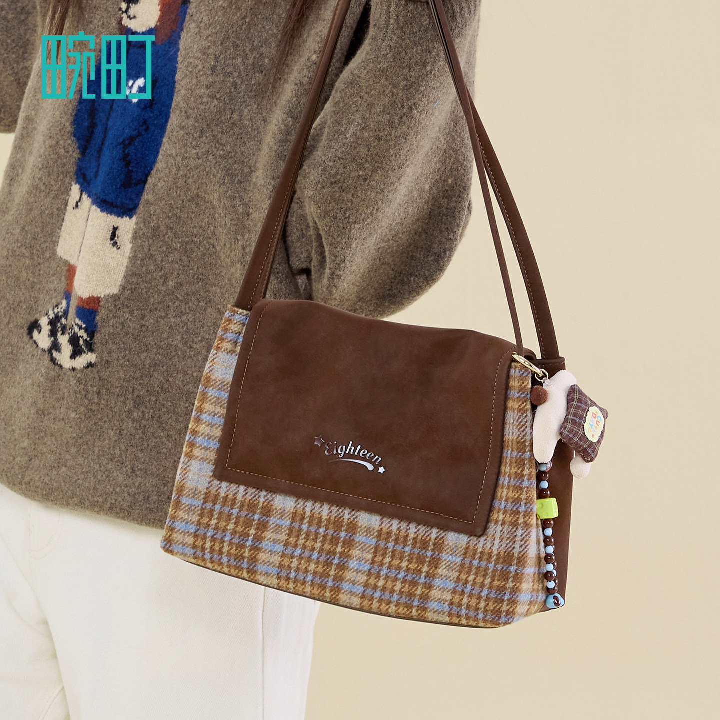 畹町复古学院风托特包秋冬女包剑桥英伦风单肩格纹包复古通勤方包