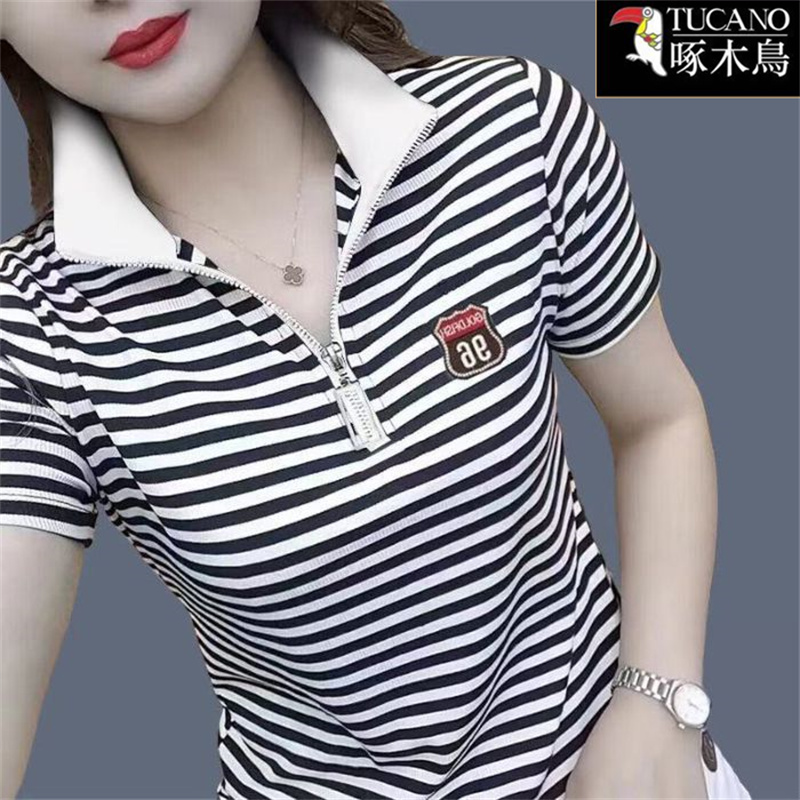 啄木鸟2025新款条纹翻领拼接t恤女夏季短袖休闲百搭宽松显瘦上衣