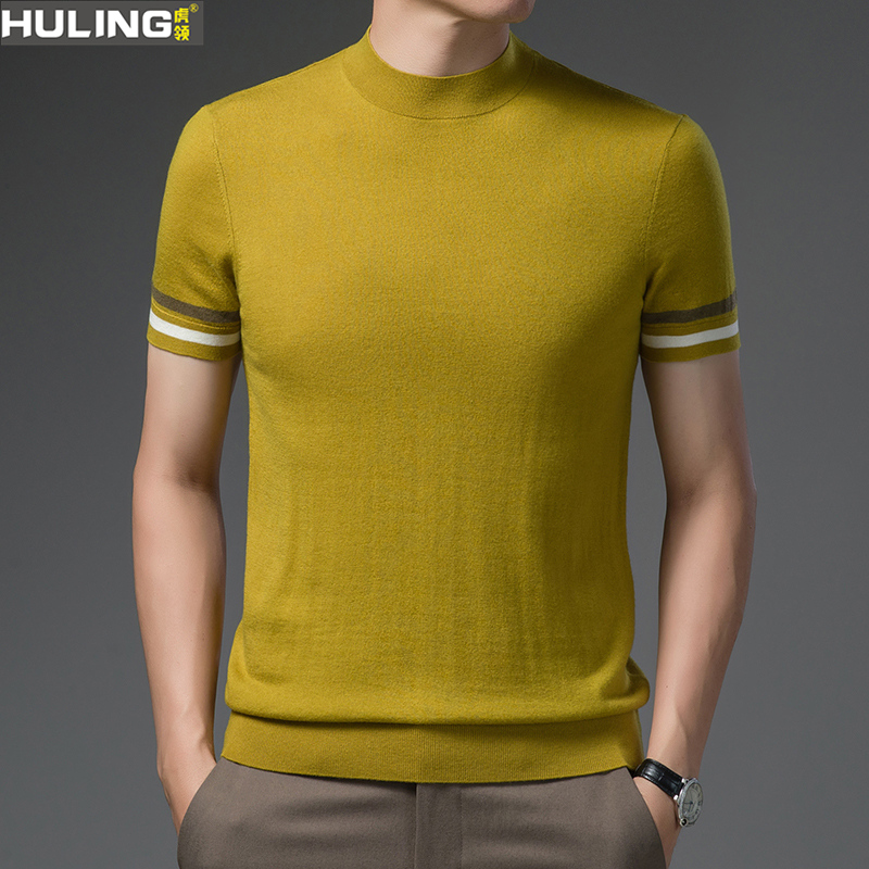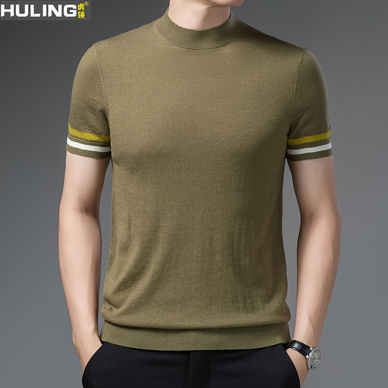 春秋季新款100%纯羊毛衫男士简约半高领短袖针织衫爸爸装毛衣打底