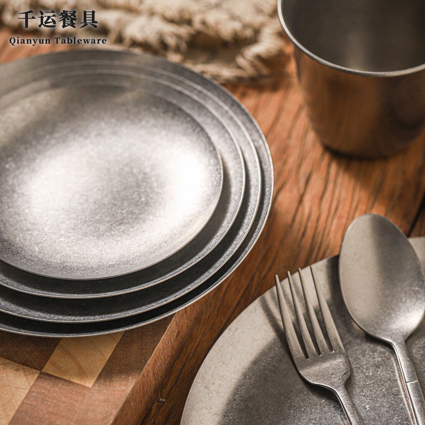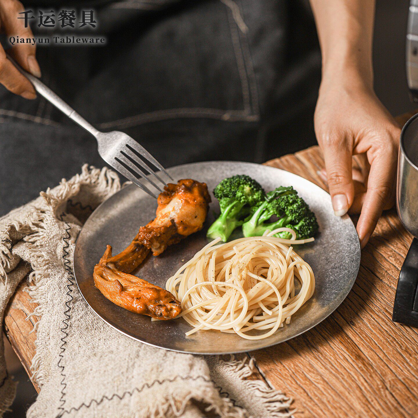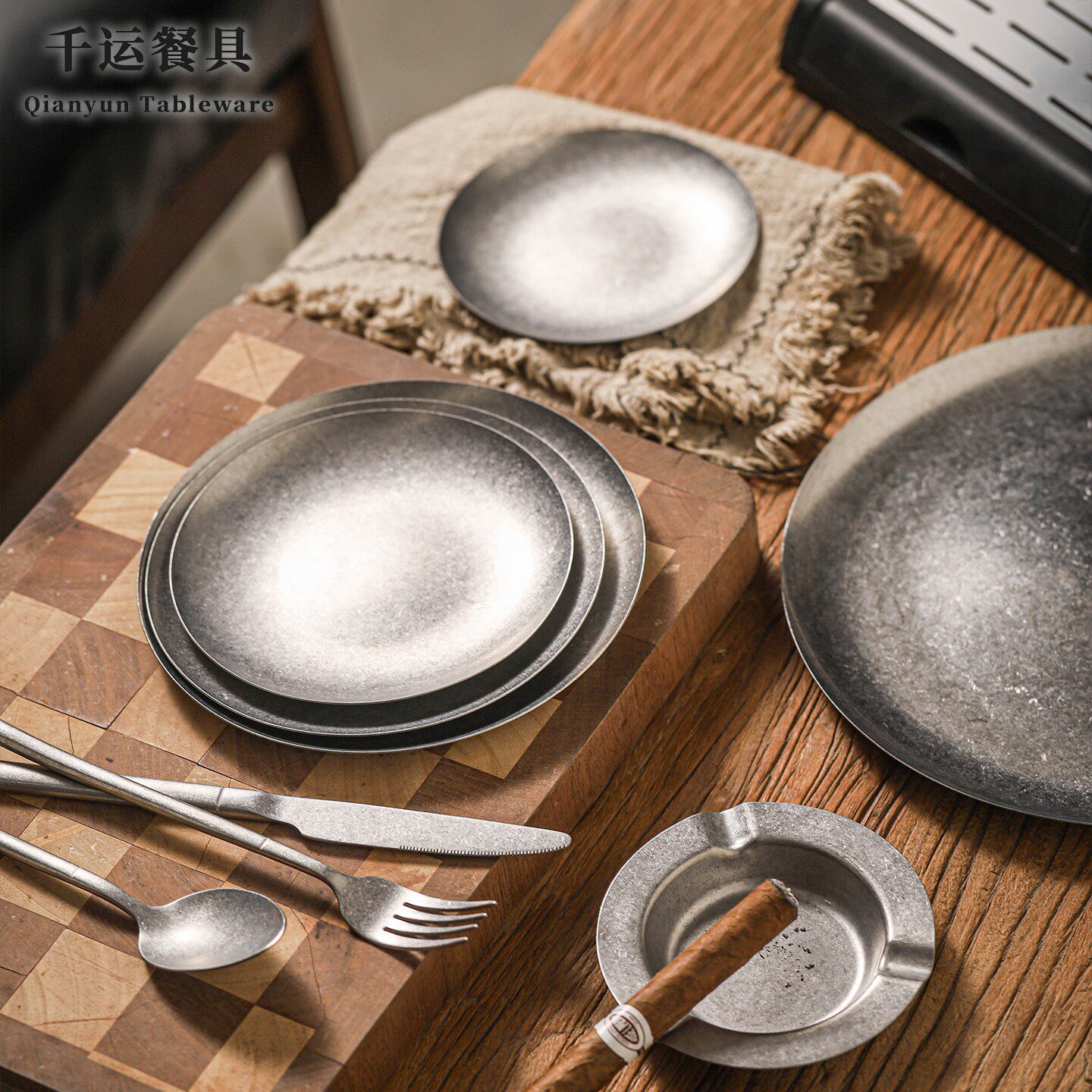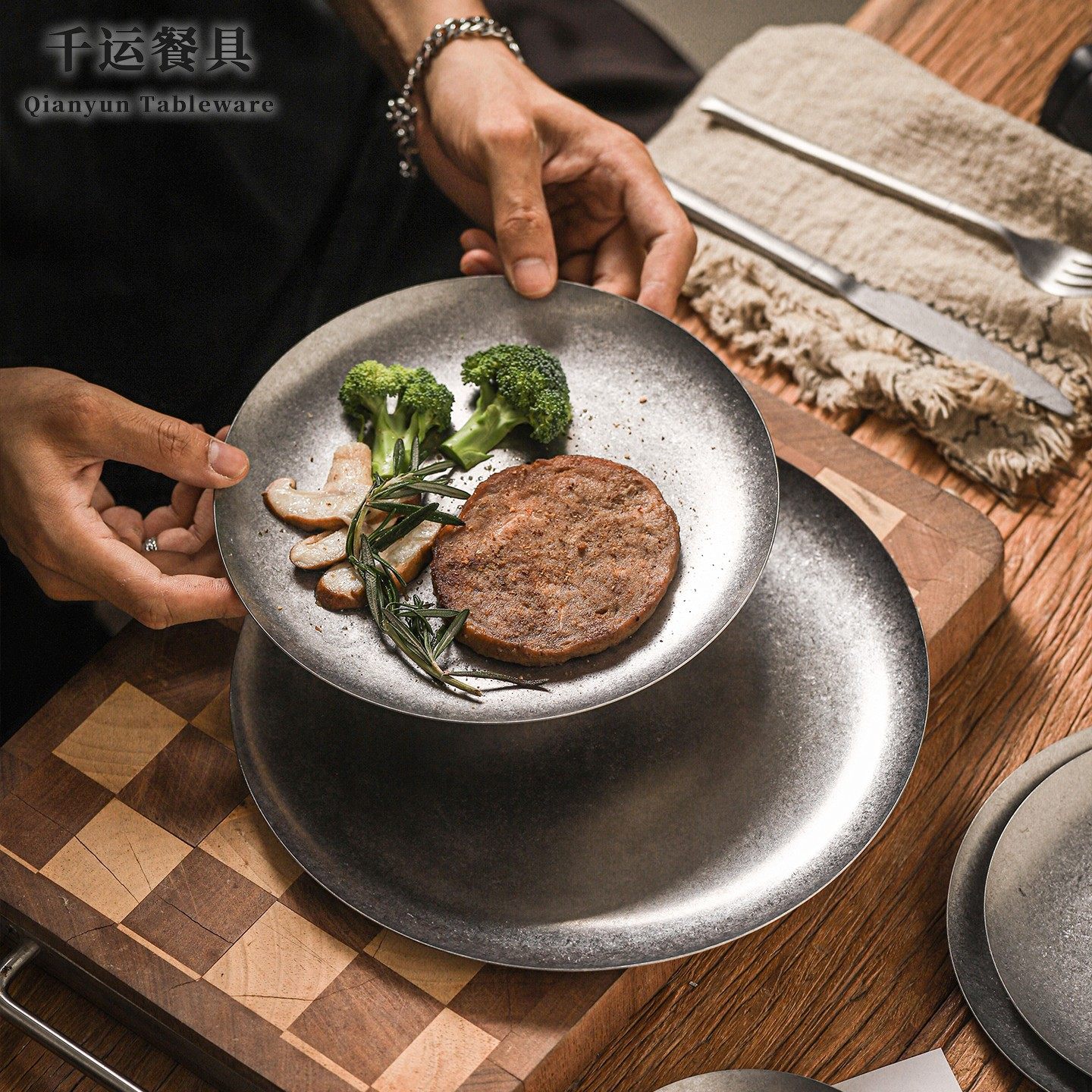美式复古盘不锈钢盘餐具西餐餐盘碟汉堡盘牛排盘摆盘商用圆盘烤肉