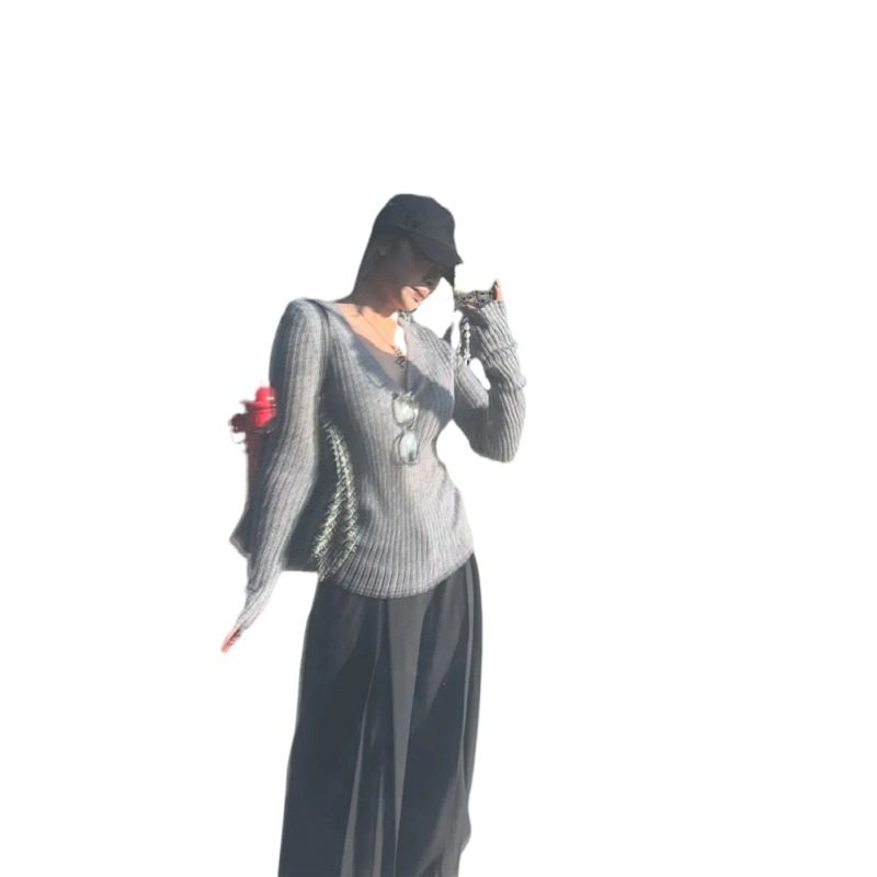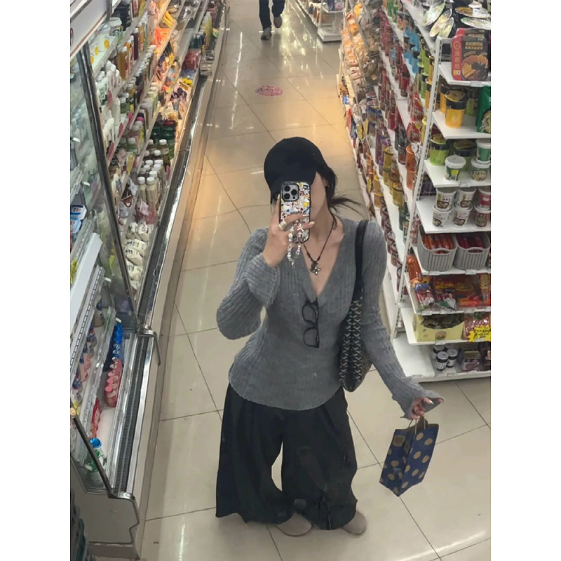 大码胖MM复古灰色v领长袖针织衫女秋新款修身显瘦内搭打底衫上衣