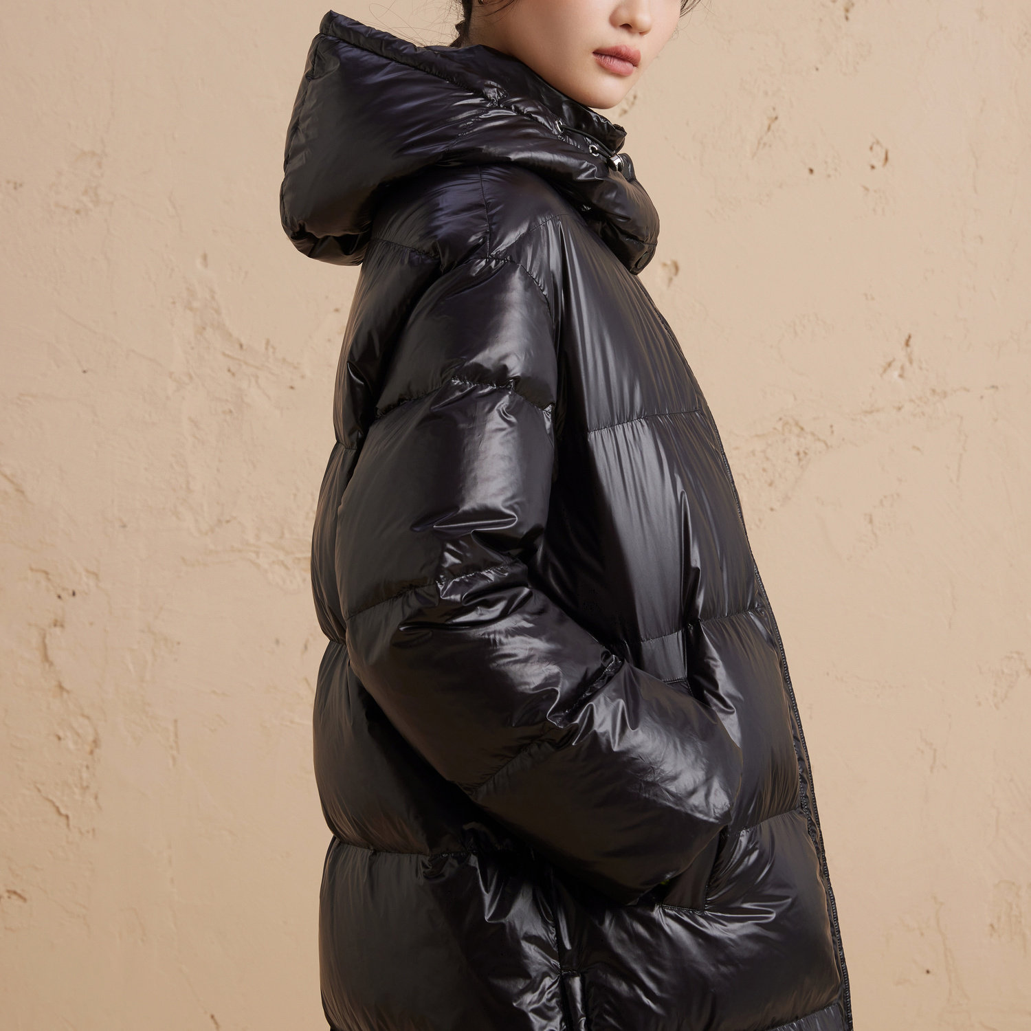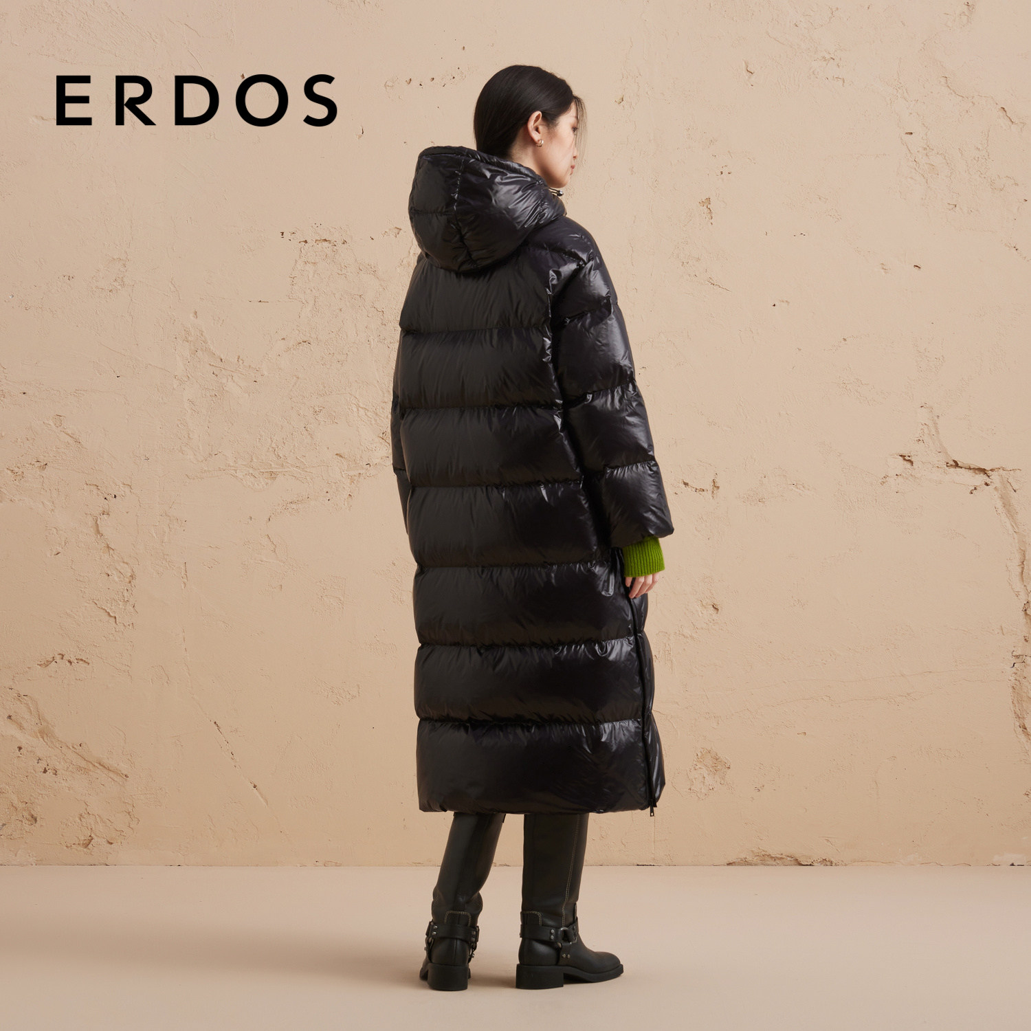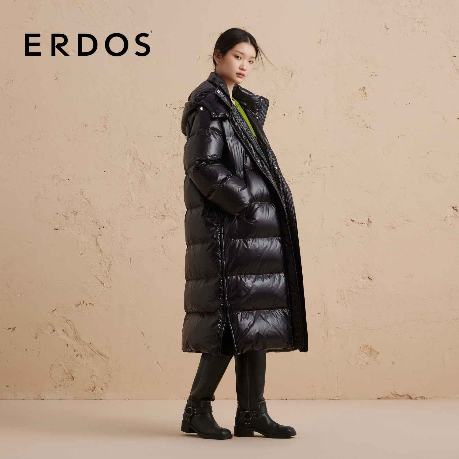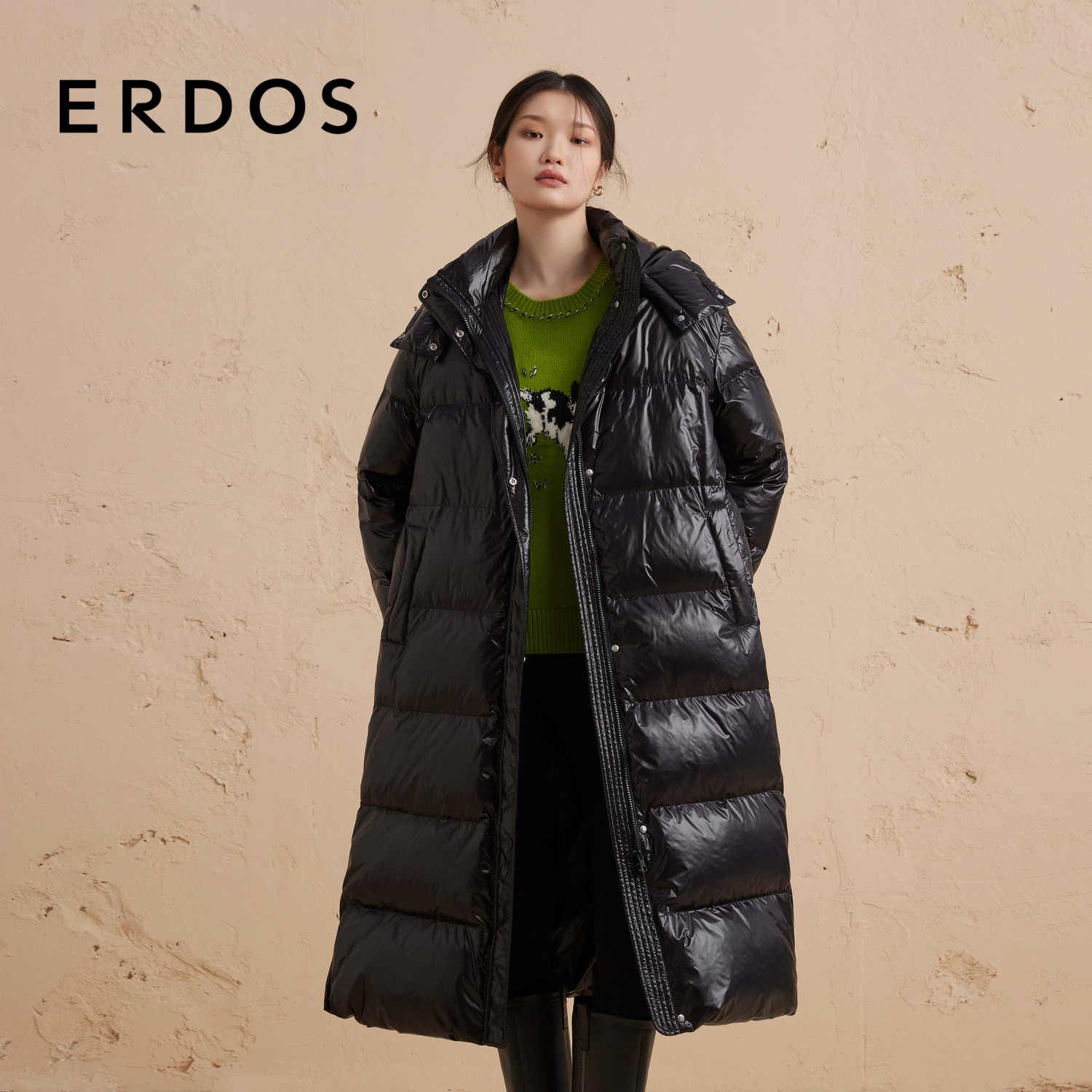 ERDOS 黑色亮面白鹅绒羽绒服女冬连帽保暖中长款厚款外套
