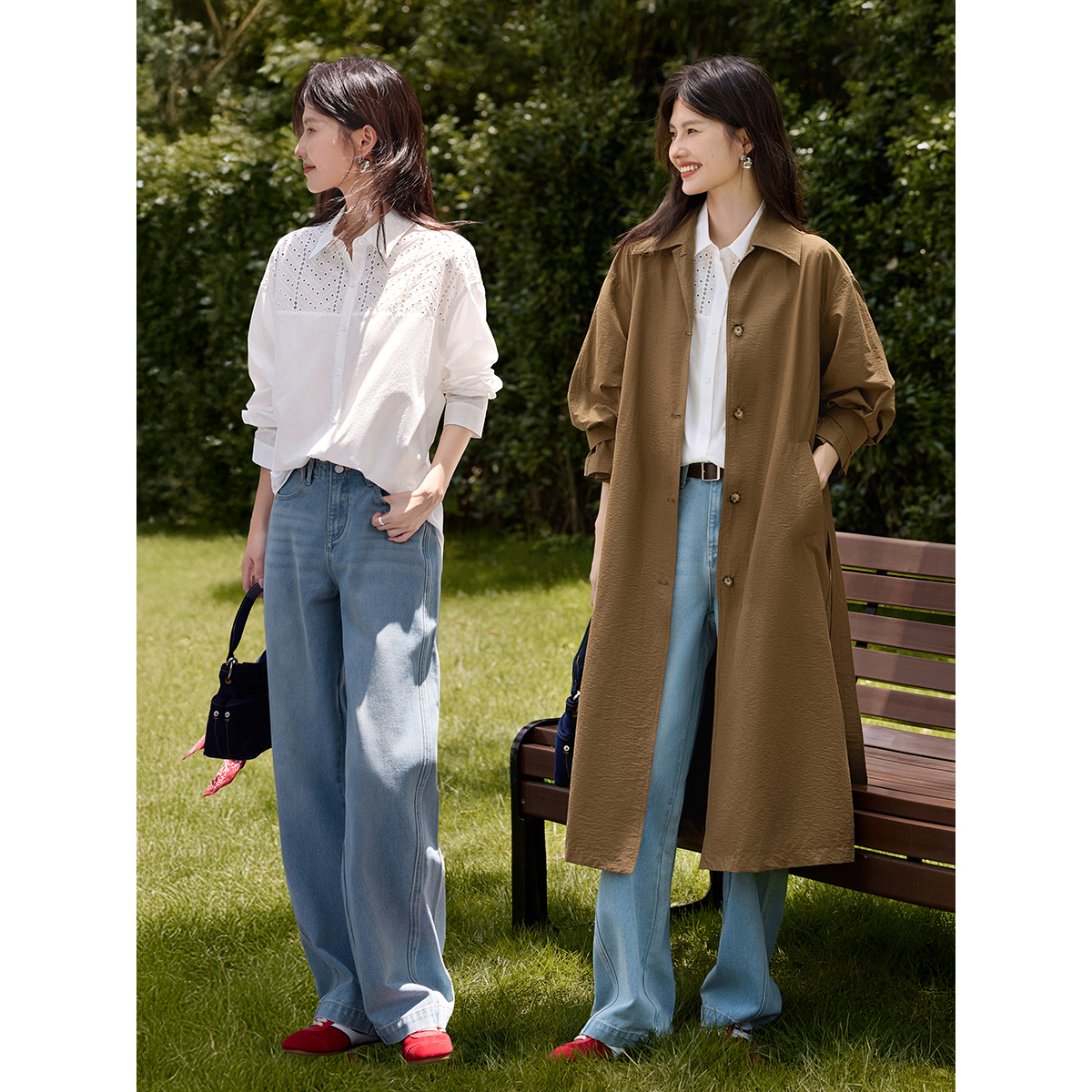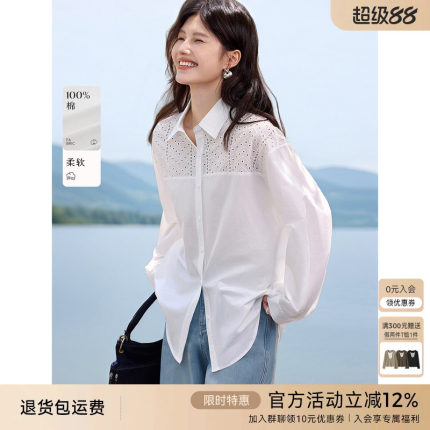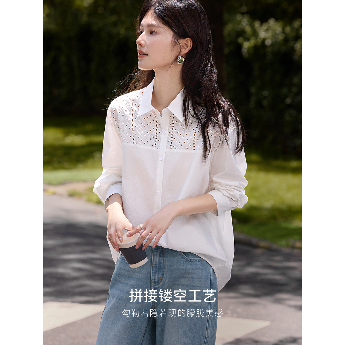 XWI欣未纯棉镂空拼接设计感白色衬衫女秋季简约百搭显瘦气质衬衣