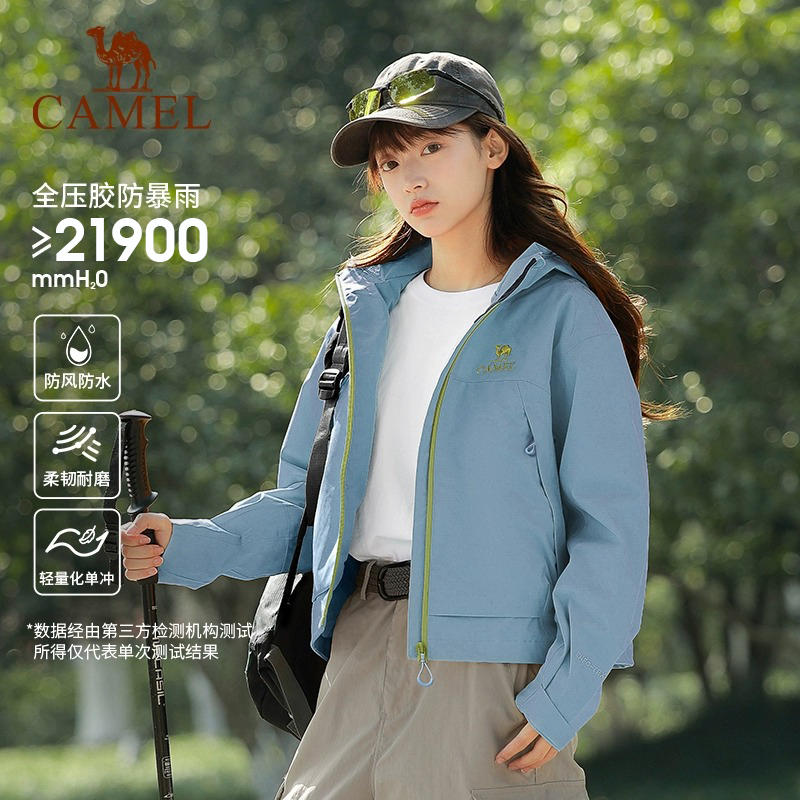 骆驼户外单层冲锋衣女小个子短款外套新款黄色防风防水旅游登山服