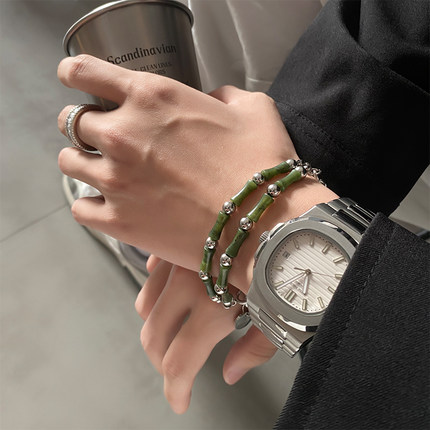 卡门 国潮ins小众设计橄榄玉竹节拼接钛钢手链男高级感情侣手饰潮