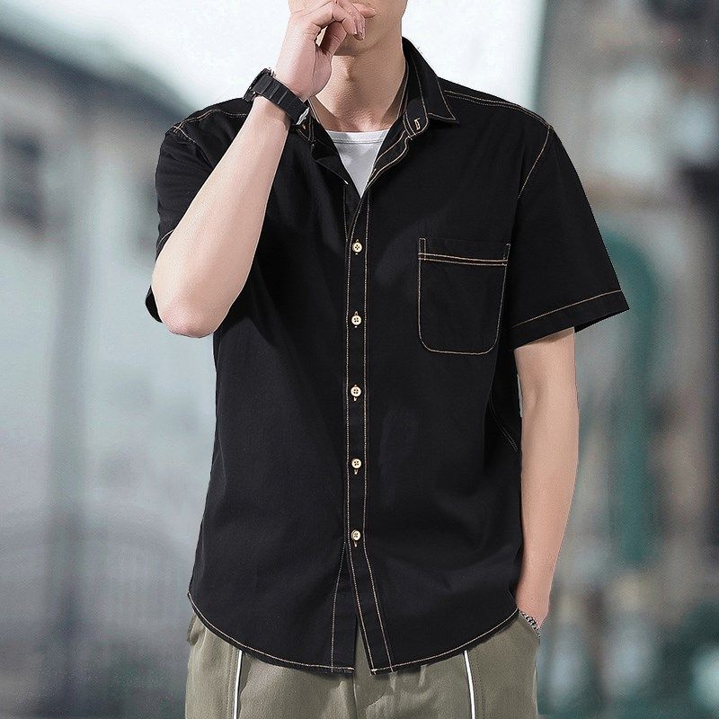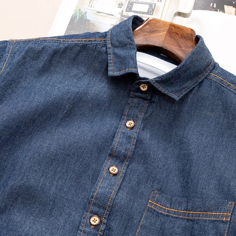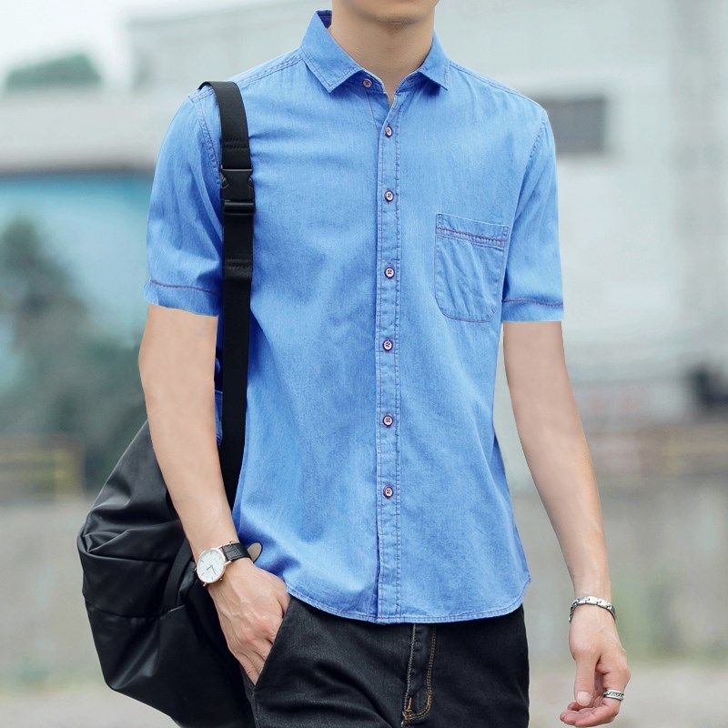 夏季纯棉薄款短袖衬衫男士牛仔宽松休闲青年纯色衬衣青年上衣外套